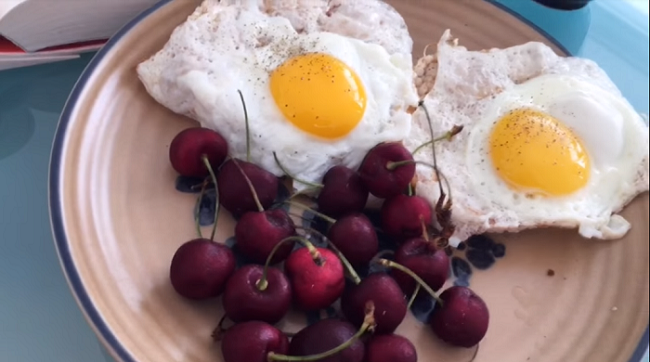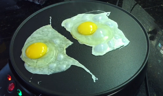 - Empezamos rociando un poco de spray de aceite de coco en el sartén y luego colocamos dos huevos para que se “frían”. Si no tienes aceite de coco, puedes utilizar cualquier otro. Recuerda colocar la sartén en fuego medio-bajo para que los huevos se cocinen parejitos.