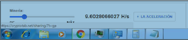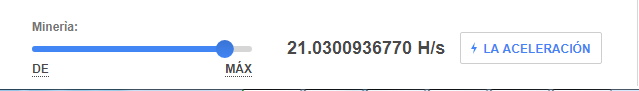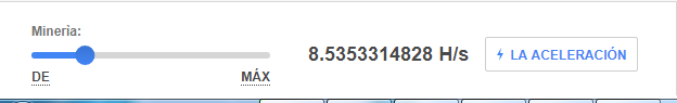 Usted puede ajustar la velocidad de extracción de los Bitcoins en el menú del panel inferior del plug-in. Ajuste la velocidad máxima para usar la memoria del vuestro computador a plena capacidad. Puede reducir la velocidad o desactivar completamente la minería en cualquier momento.