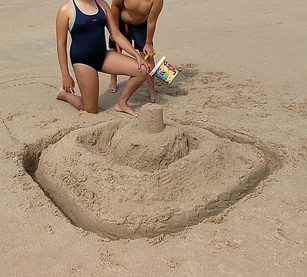 Por la mañana desayunamos tostadas con tomate. Luego fuimos a la playa del Carmen. Construimos un castillo de arena de dos pisos con muralla y pozo incluidos.