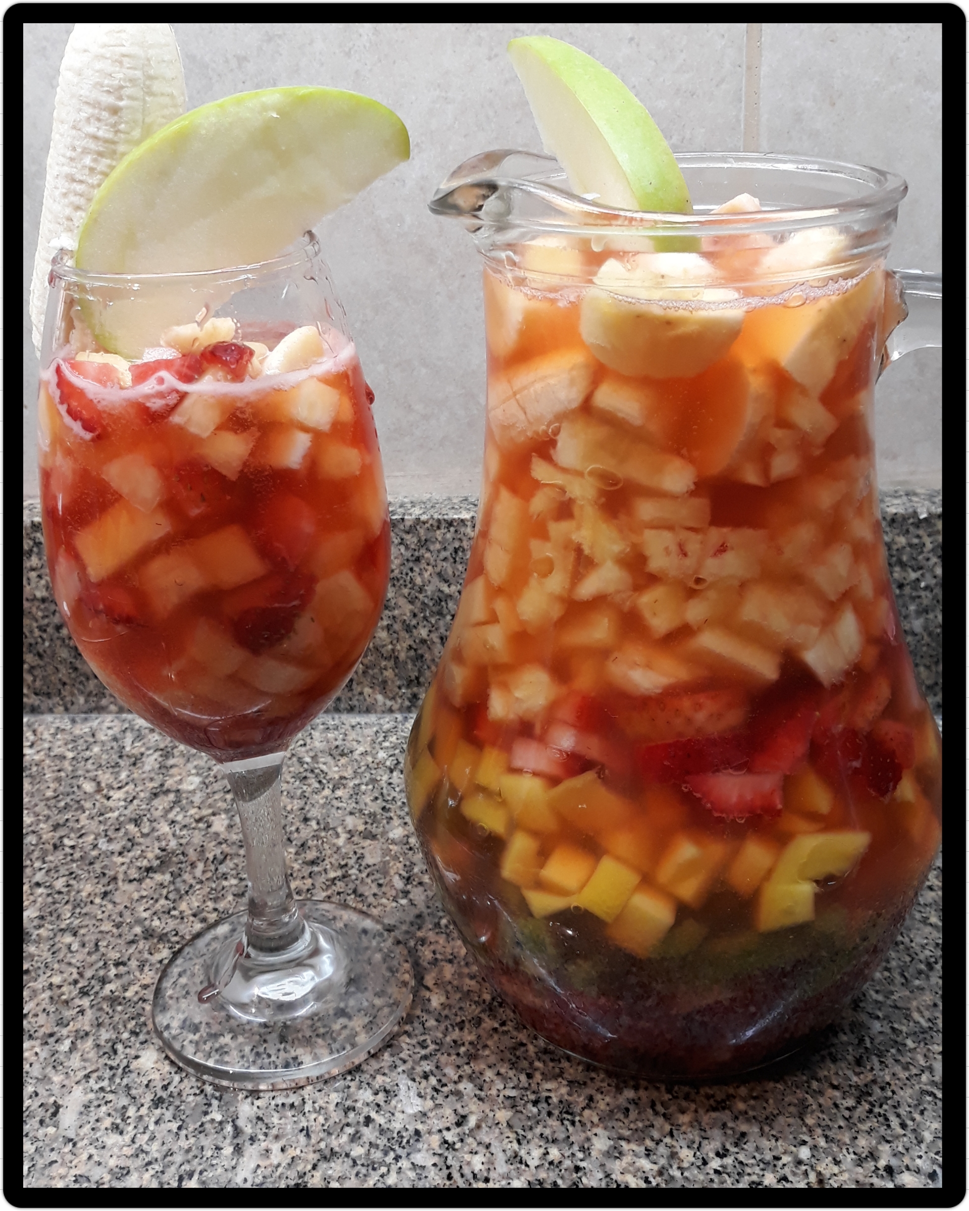 - Asi queda, revolvemos un poco para mezclar las frutas, unos le colocan granadina, otros colorante para darle un rojo a la tizana.