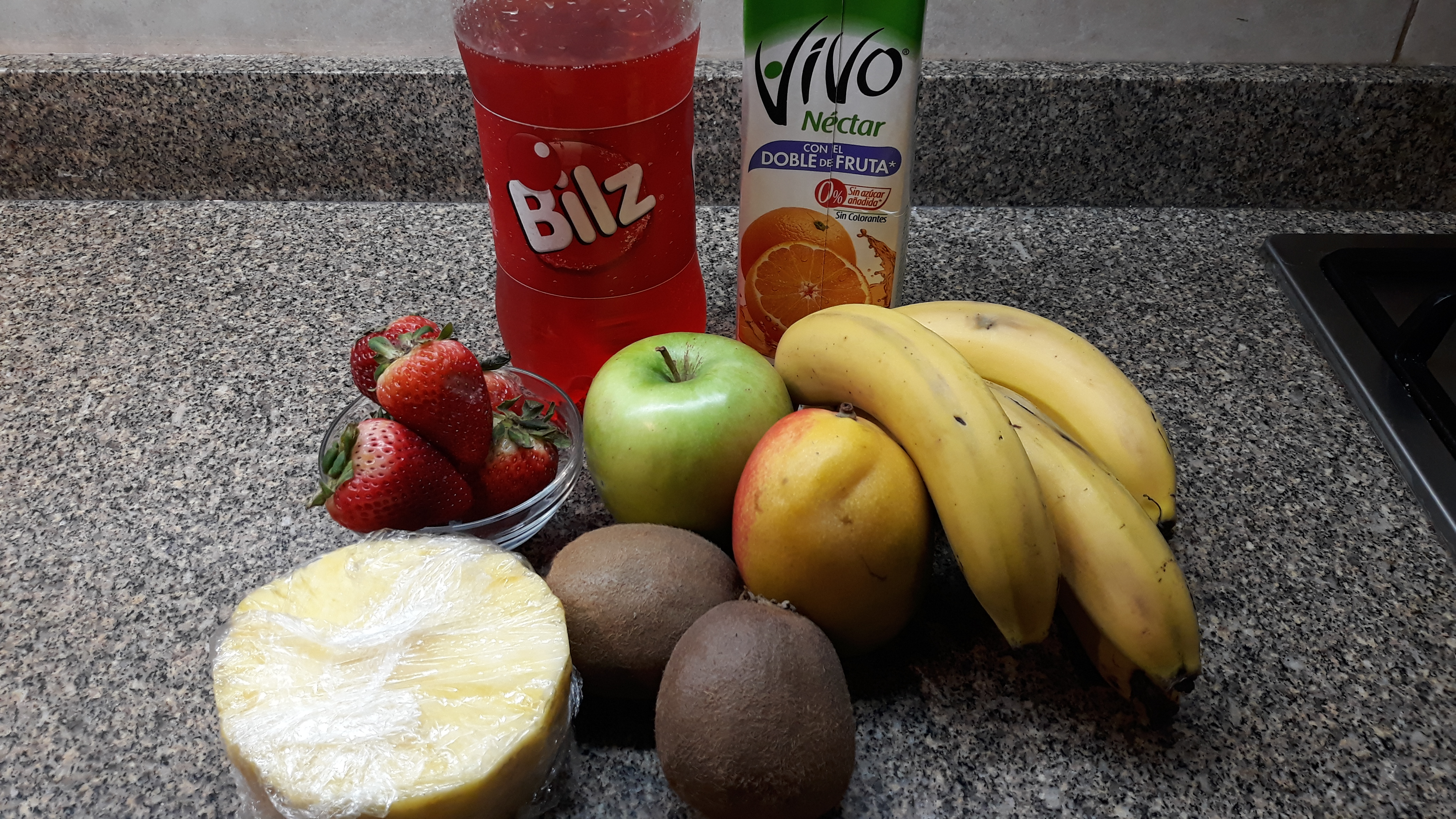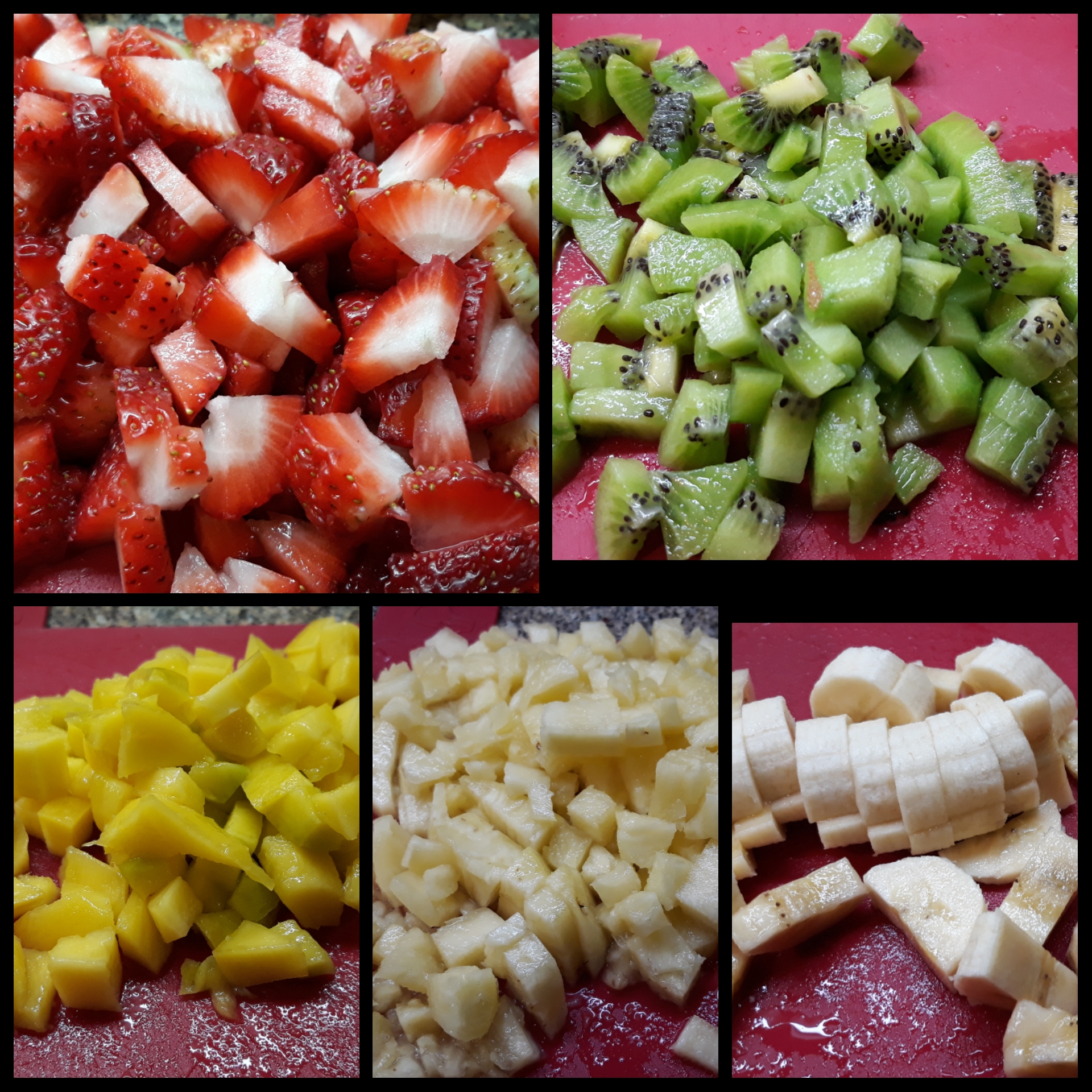 - Todas las frutas se lavan y cortamos en trozos pequeños, dejando de ultimo el cambur y la manzana, para que no se coloquen de color oscuro.