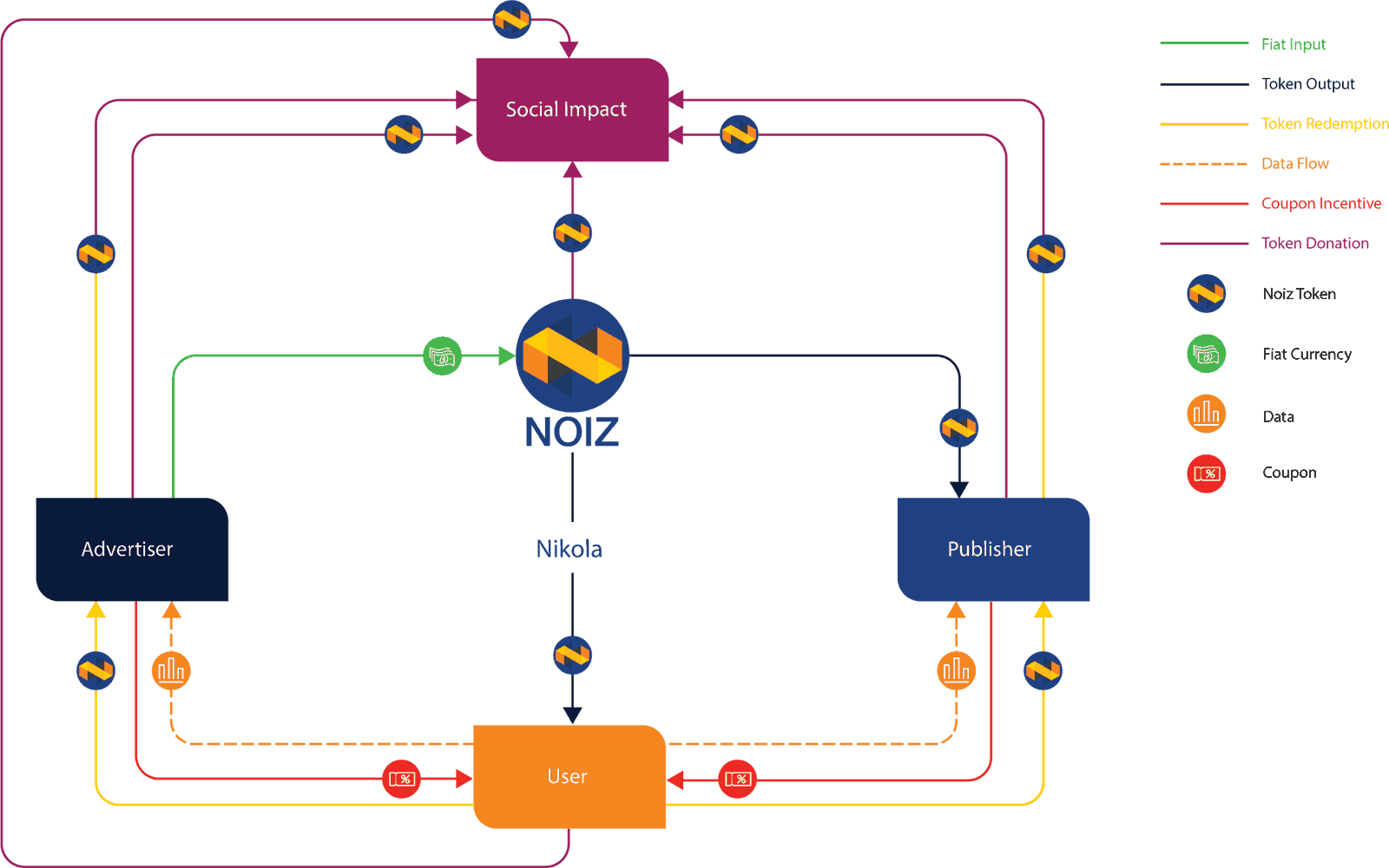 El ecosistema NOIZ utiliza el token NOIZ, que facilitará todas las transacciones en todo el ecosistema de la red publicitaria NOIZ.