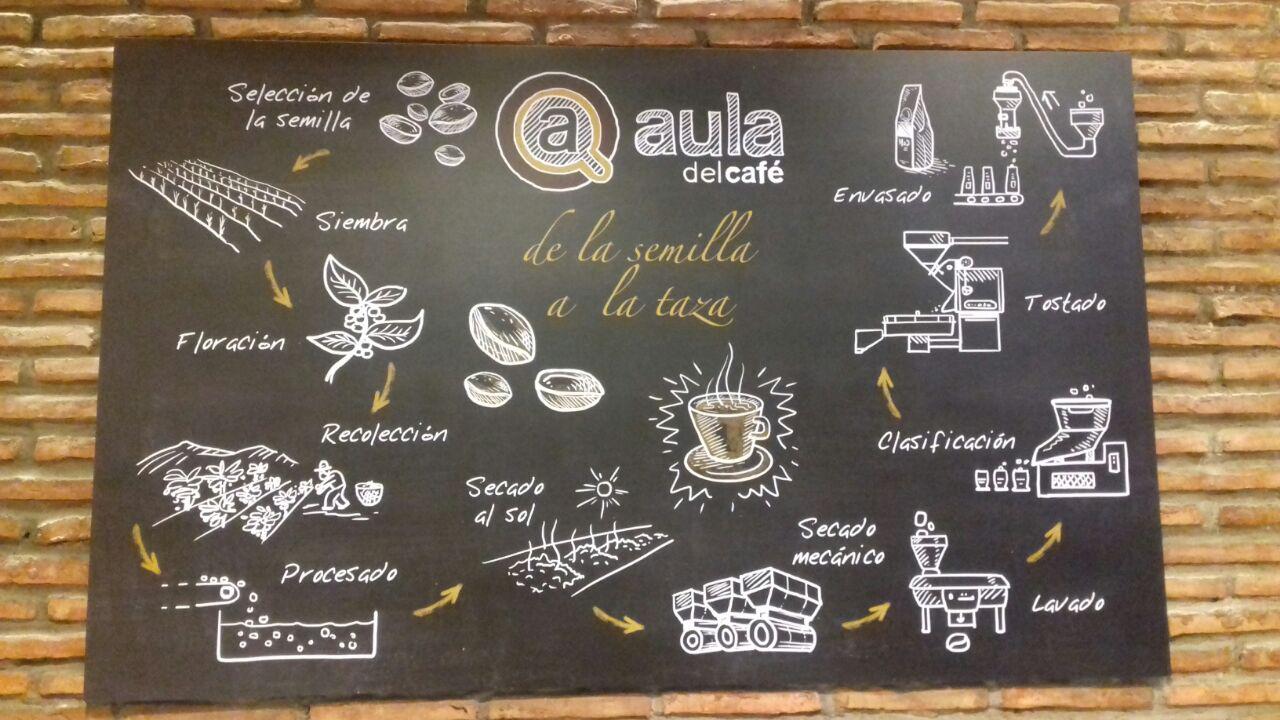 Cuando llegamos a la cafetería hubo algo que me llamó mucho la atención, fue un cuadro inmenso colgado en una pared de la cafetería, en el cual explicaba cual era el proceso de elaboración del café.