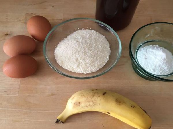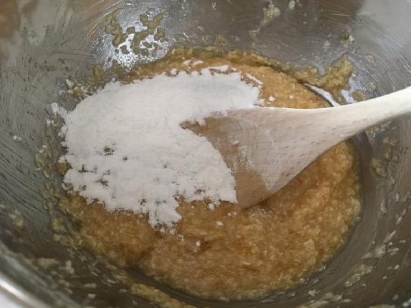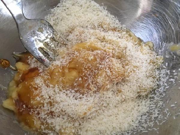 • En un envase grande se tritura el cambur maduro, y luego se mezcla con la miel, el huevo y el coco rallado. Después batimos bastante hasta que quede una pasta muy homogénea.