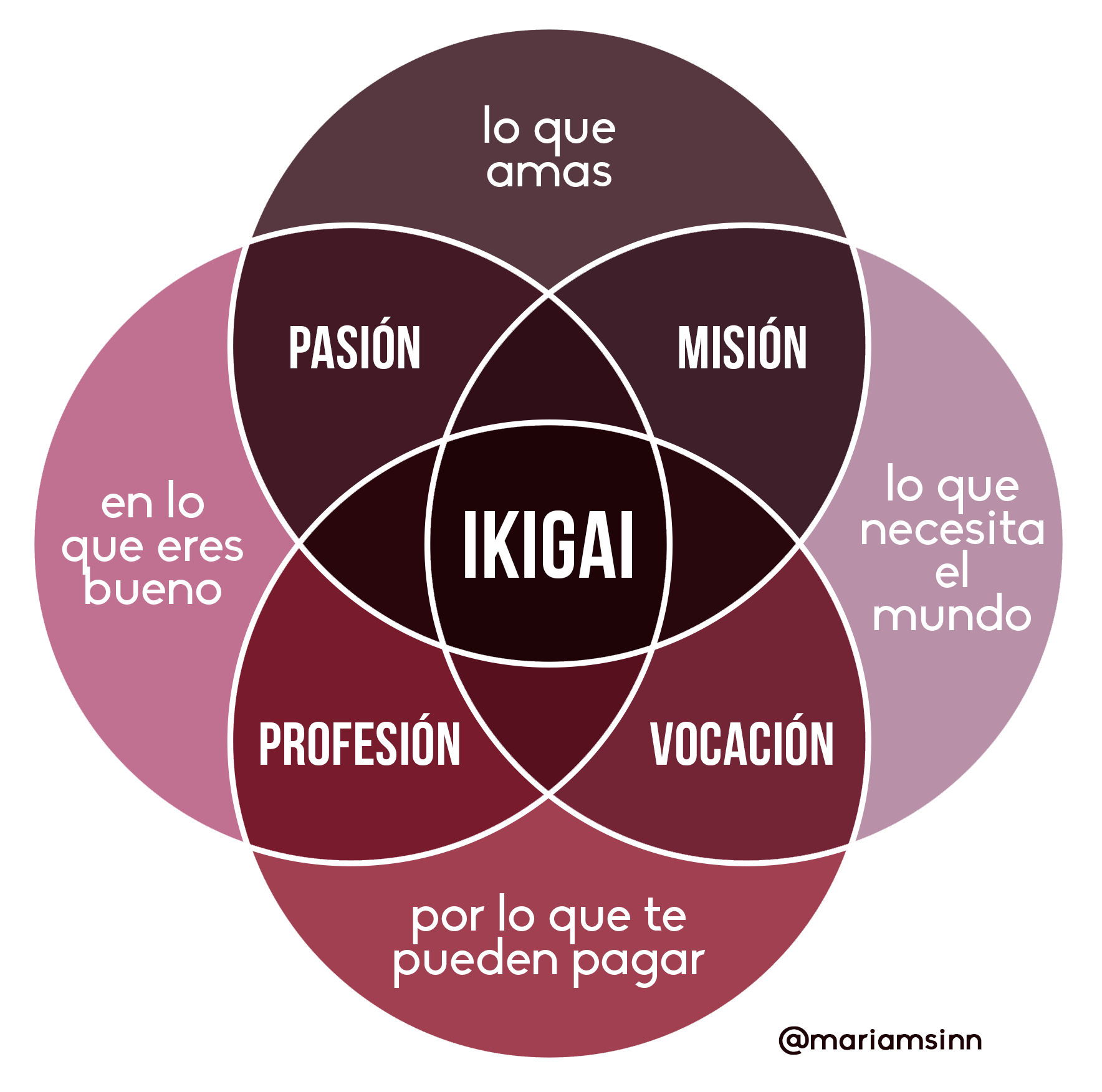 Totalmente de acuerdo. El Ikigai es una súper herramienta que te permite enfocarte en tu verdadera razón de vivir, pero no es nada fácil descubrir cuál es tu Ikigai. Para ello debes seguir una serie de pasos y profundizar mucho en tu ser. Acá te dejo una imagen donde se explica mejor: