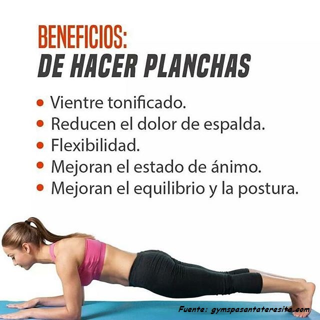 La plancha tiene muchos beneficios, ya que en esta posición se trabajan varios grupos musculares. Es una manera muy sencilla de ejercitar abdominales y lumbares, fortalecer la zona media, cuádriceps, hombros y dorsales.