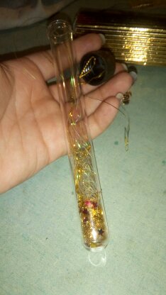 - Abril un agujero a la tapa del tubo de ensayo en el medio, añadirle al frascos las tiras brillantes y la escarcha.