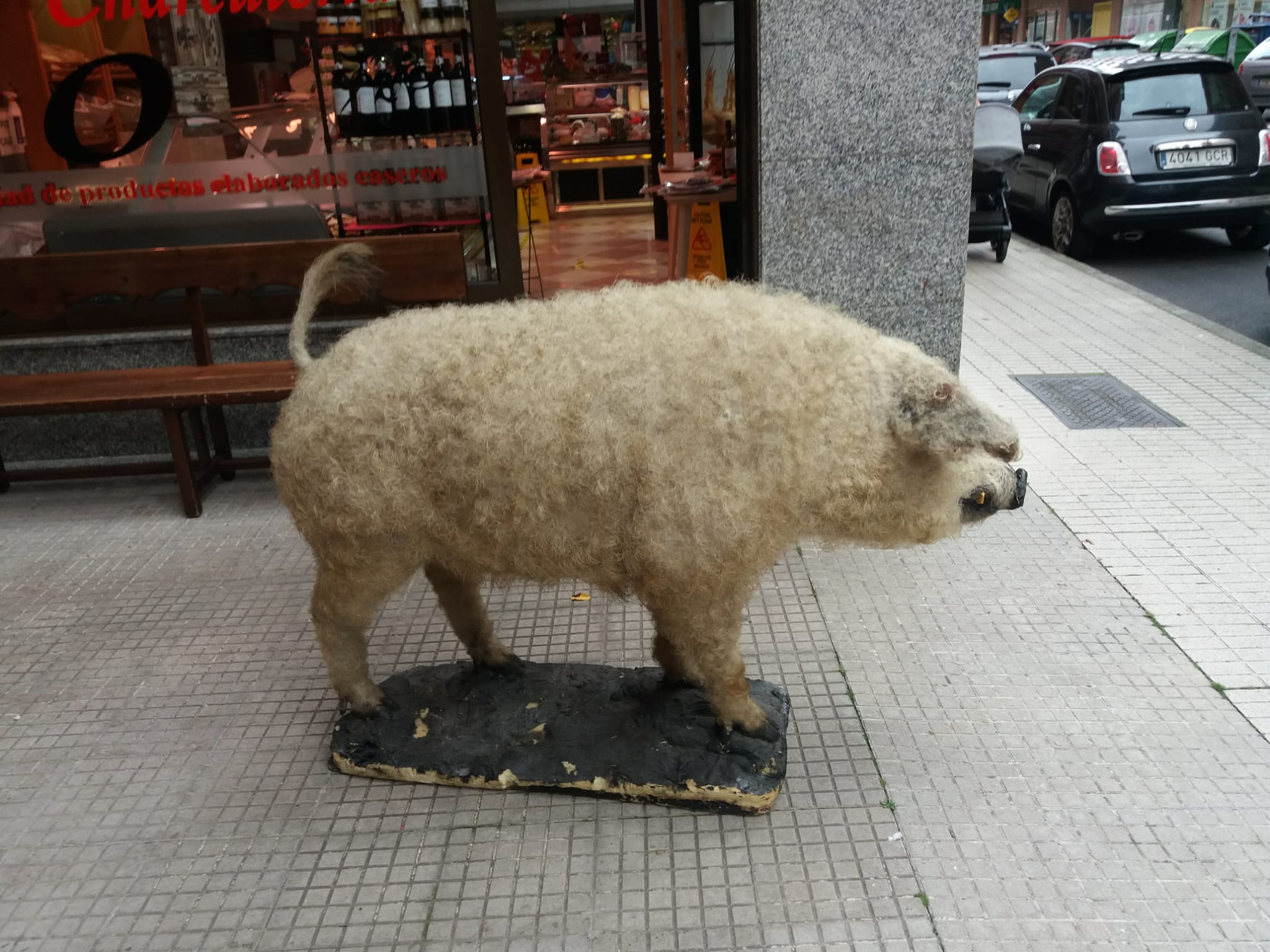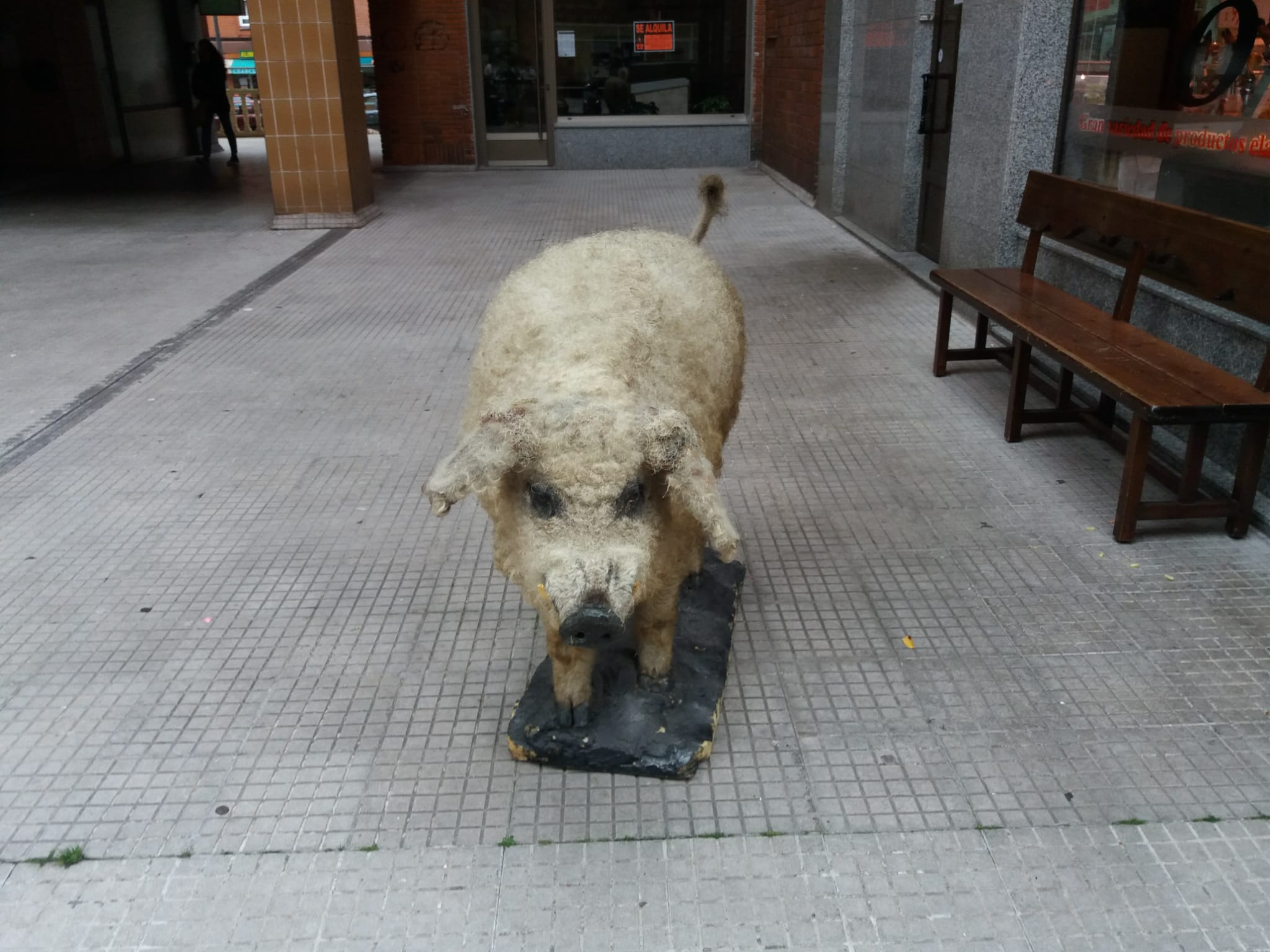 El poner como reclamo un cerdo disecado en la calle por parte de una carnicería no se si es lo más apropiado, pero si se tiene que reconocer que es curioso.