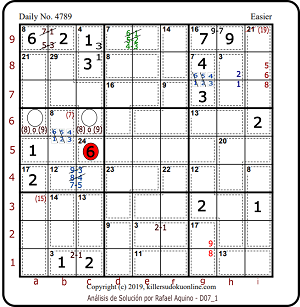 El Diagrama 07_1 nos muestra como quedó en la entrega anterior, donde colocamos el número 6, encerrado en un circulo rojo. A continuación pasaremos al siguiente diagrama donde haremos nuevos estudios para ubicar números candidatos.