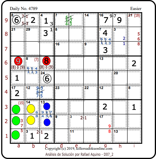 - Veamos la columna c. Coloque el 8 (Círculo rojo - casilla c6) y no el 9 porque en los círculos azules hay un 9.