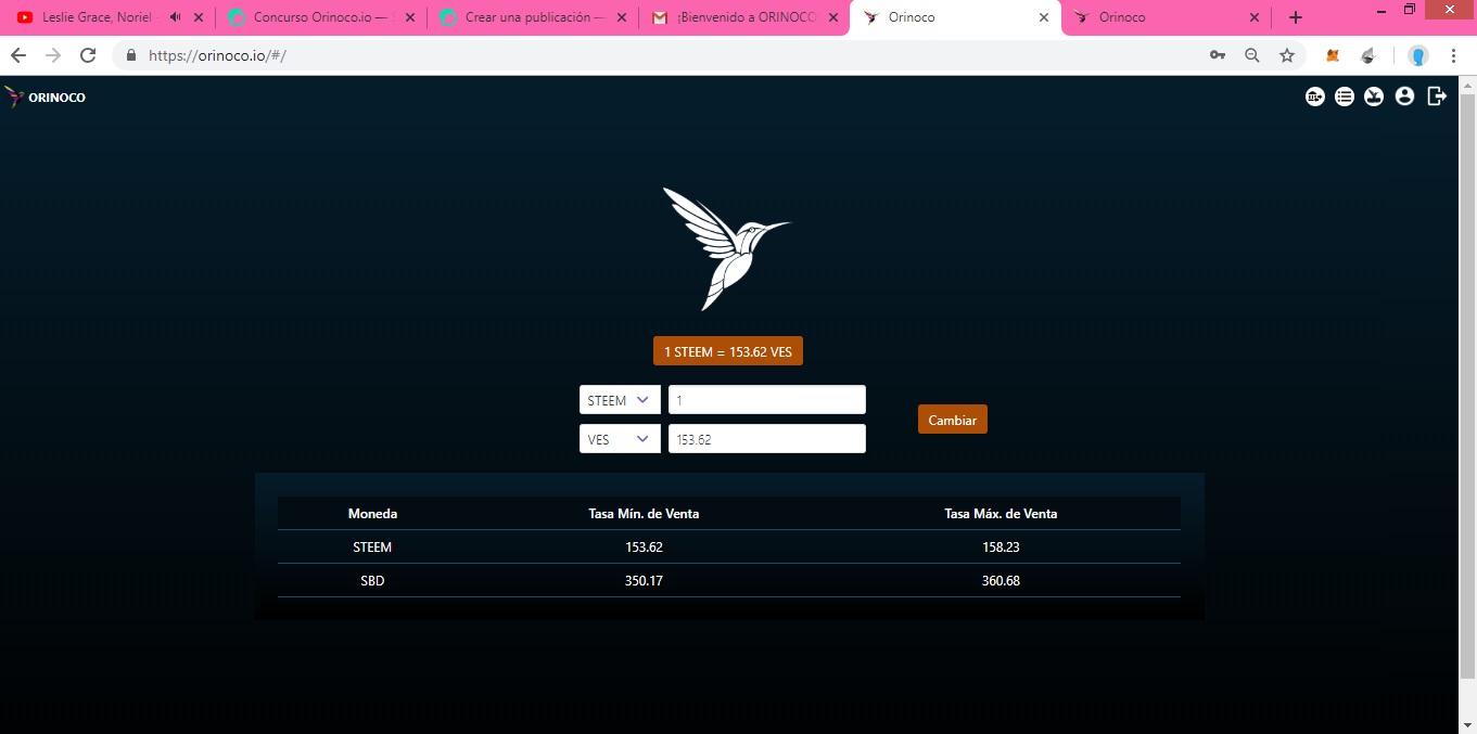 Hola queridos, esta es mi entrada para el concurso de Orinoco y su nueva plataforma. Una plataforma que se encarga de realizar el cambio de tu moneda steem o sbd a Bolivares. Caracterizados por su rapidez usando de referencia al colibrí.