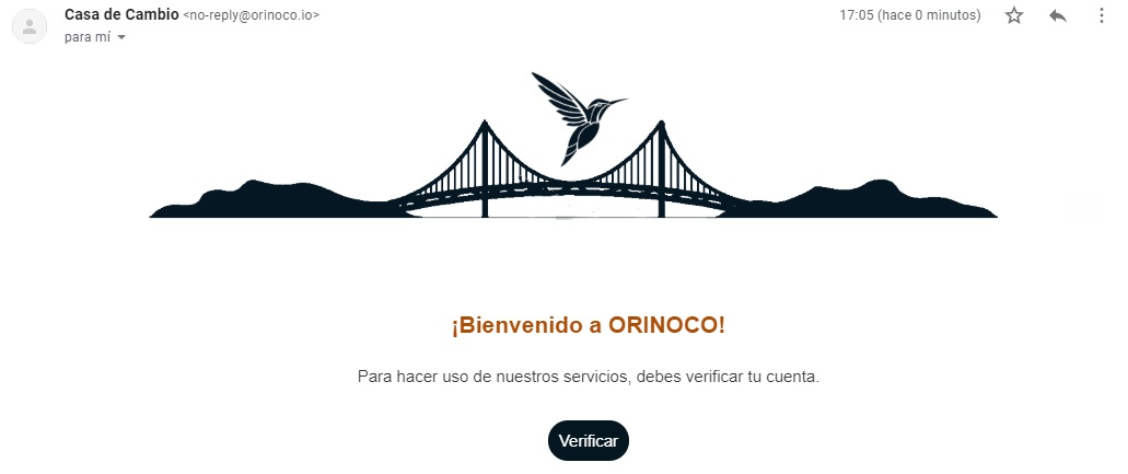 1.- Registro en https://orinoco.io/#/: Para el registro solo debemos ir aquí, buscamos la opción registro y debemos escribir los datos solicitados; en la imagen podrán observar, inmediatamente recibiremos un email para verificar la cuenta.