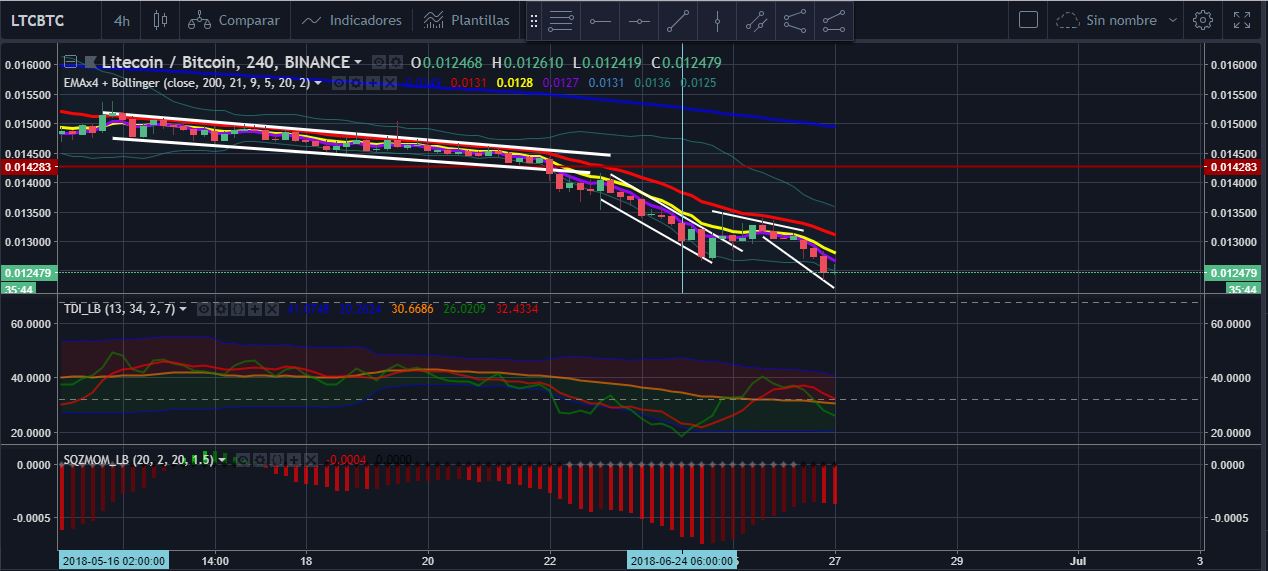 Ltc es influenciada por la caída del Btc; después de una ronda de velas rojas, puede dar un pequeño revote, porque el volumen negativo esta bajando. Puede llegar al precio de 0.013 antes de seguir su tendencia bajista.