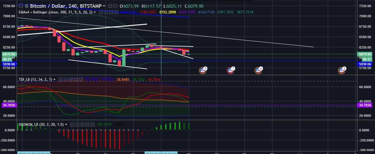 Bitcoin sigue con su tendencia mayor a la baja, a pesar de que el volumen de compras es positivo, fue no lo suficientemente fuerte para romper el techo de los 6200. Tranquilamente puede toca el precio de 5930 y volver al canal de 6200 a 6000.