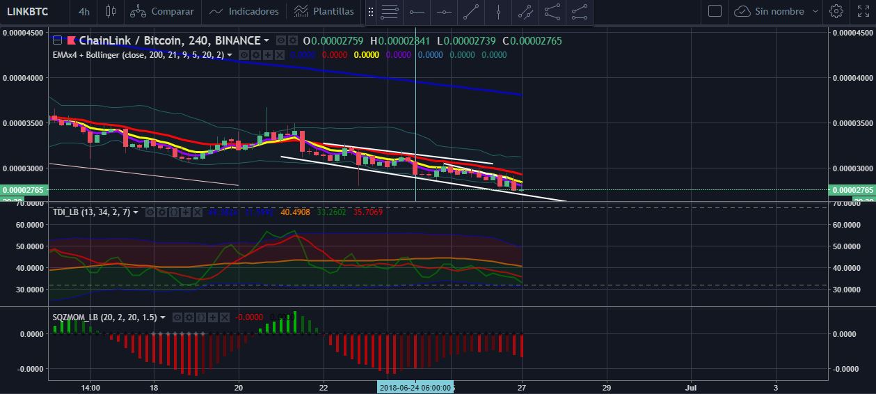Link esta en un canal bajista y parece que no va parar, sin embargo ya toco las bandas bollinger y puede dar un salto de precio hasta los 0.000030