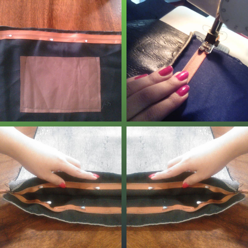 Lo siguiente será fijar el zipper, teniendo cuidado en que: quede a ambos lados exactamente a la misma medida, que abra y cierre sin deformar el bolso y que sea del mismo color del forro –en mi caso utilicé este porque quería que se viera bien–. Para esto puedes apoyarte fijándolo bien a la tela con alfileres o hilvanandolo con mucho cuidado. Esta es otra de las partes que fácilmente pueden hacerse a mano, sin embargo preferí utilizar la máquina de coser para reforzar.
