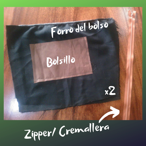 Opcional: corta dos piezas de una tela mucho más delgada y preferiblemente negra con las mismas medidas del cuerpo del bolso para que sirvan de forro, yo le agregué además un bolsillo a uno de los lados. También puedes colocar un Zipper/Cremallera/cierre –o como le digan en tu región– que deberá tener la misma medida de la parte superior de tu bolso, que en este caso es de 45 cm.