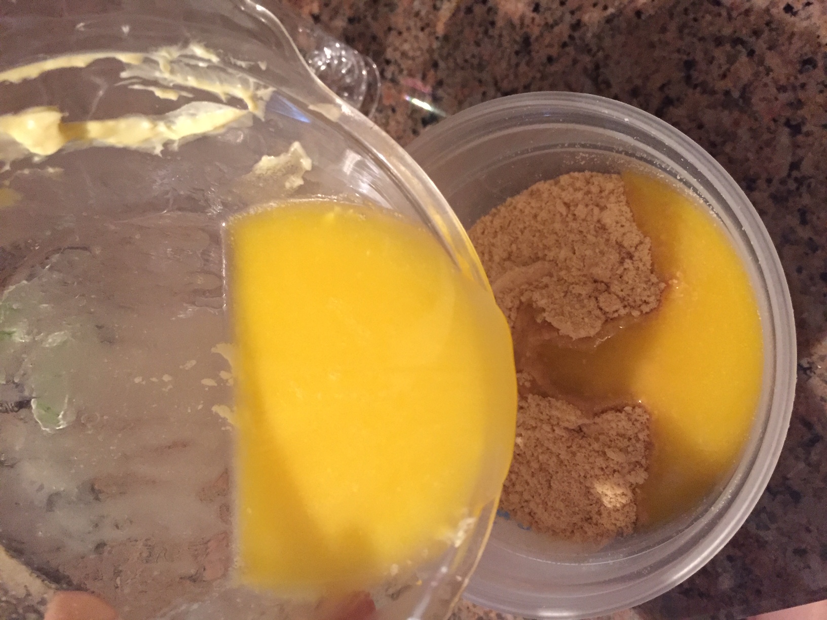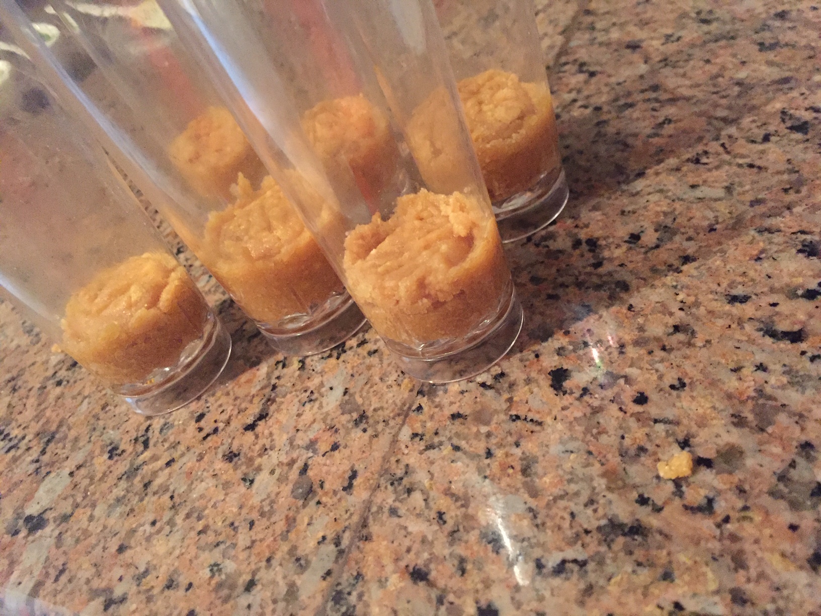 Vamos a triturar bien la galleta hasta forma una especie de masa con la mantequilla, y lo colocaremos en los envases, preferiblemente transparentes y largos, llevamos unos minutos a la nevera.