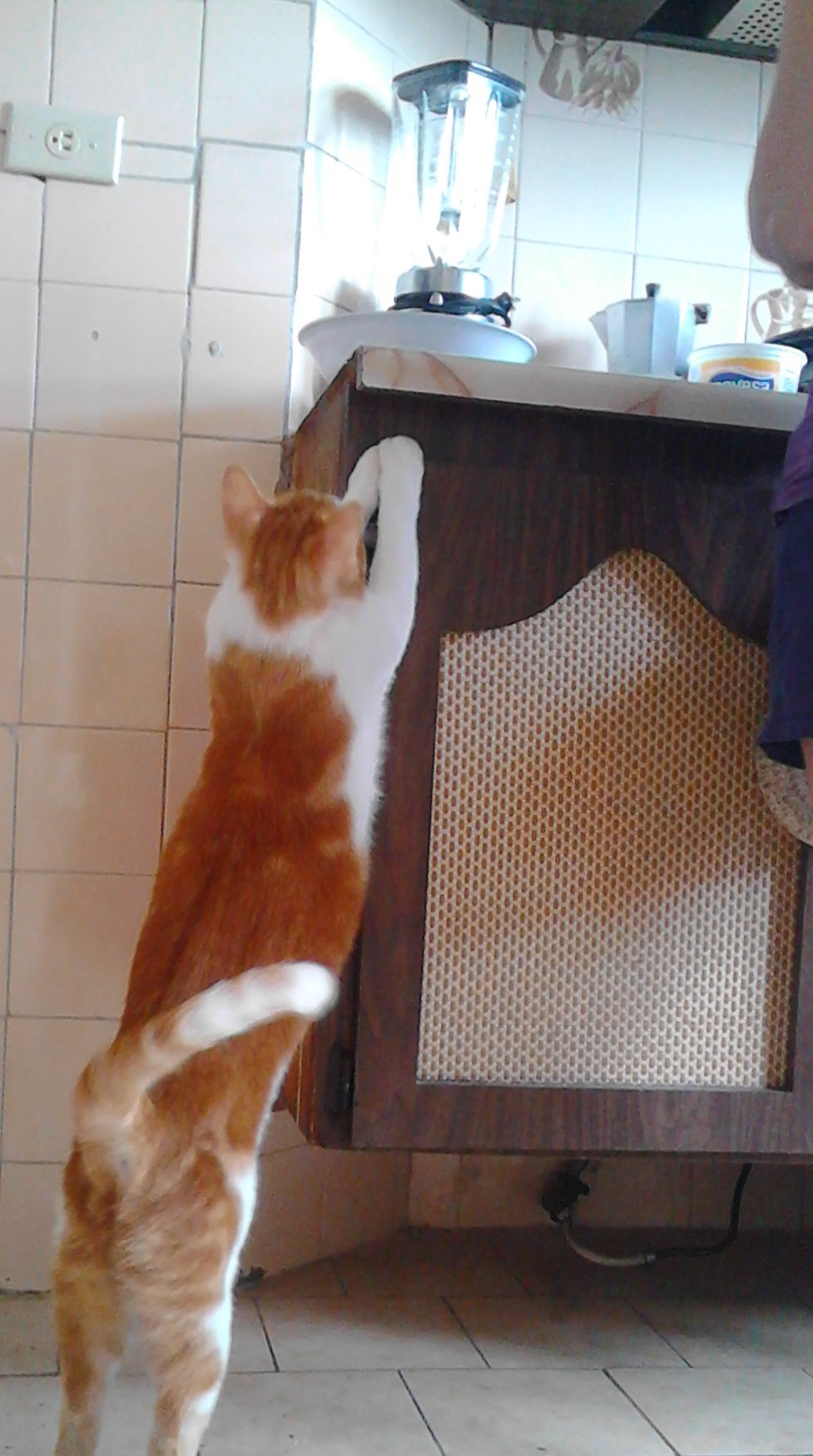 Descubrió que hay un lugar mágico que se llama cocina, que tiene fuentes interminables de alimentos, y que si pone carita tierna y se para en dos patitas, esta señora le da de la rica comida que siempre prepara.