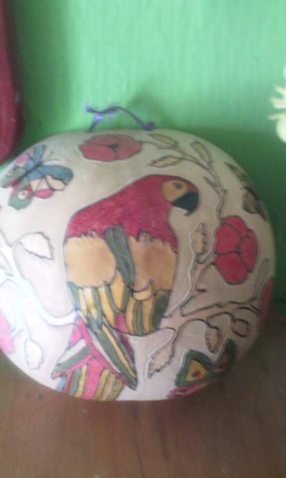 La linda guacamaya o papagayo es detallada en un fruto de tapara, convirtiéndola en una totúma para decora la casa.