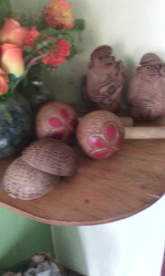 Estas decorativas maracas son elaboradas con taparos pequeñas, extrayendo la pulpa por un orificio, llenan de semillas de capacho y con un palo bien moldeado tapan el orificio.