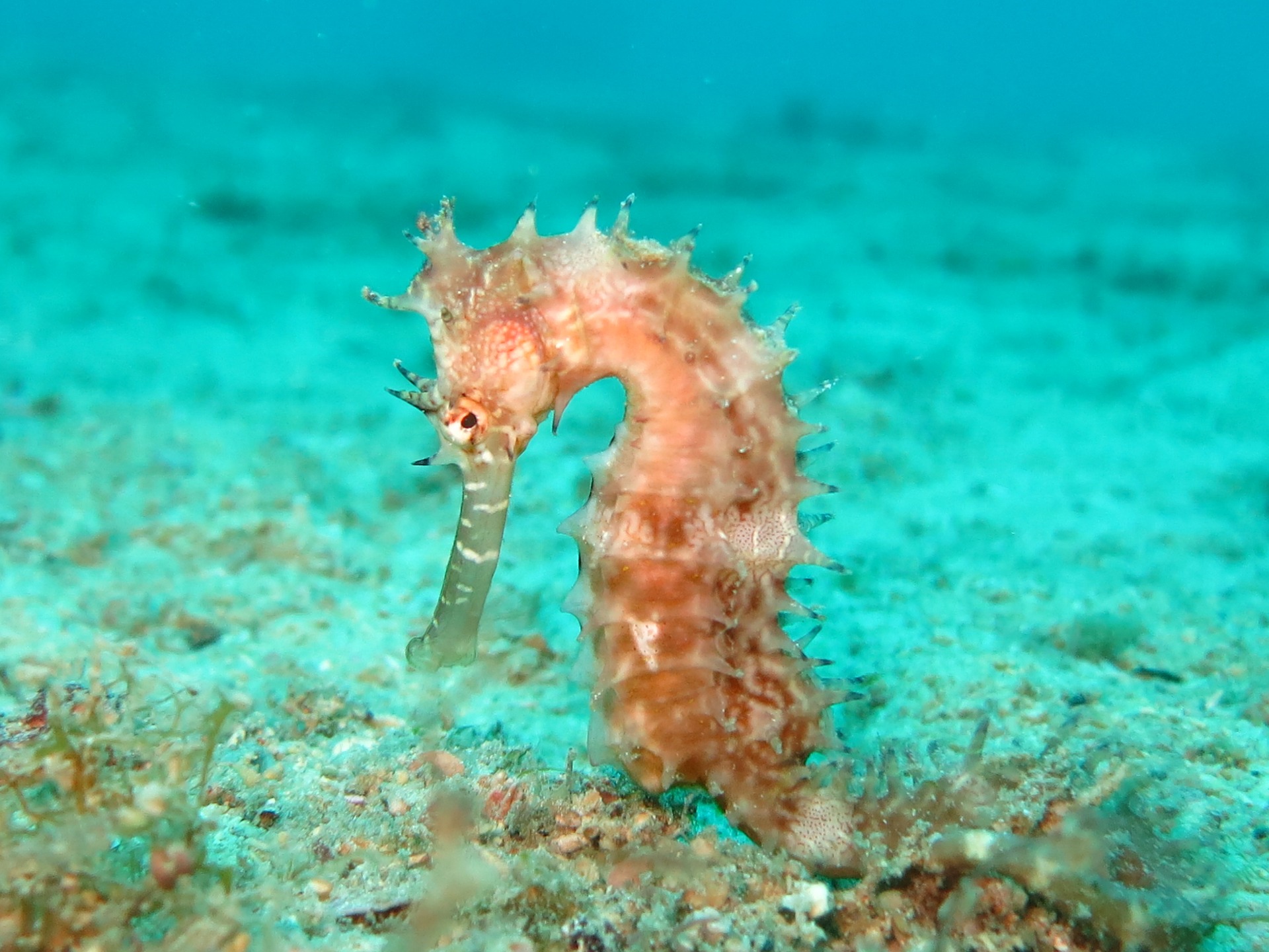 El hipocampo (o caballito de mar) no se puede confundir con ningún otro ser acuático ya que su aspecto es único: es inevitable compararlo con un equino. Su tamaño fluctúa entre la media y las ocho pulgadas de largo. Consta de aletas pectorales cortas y una aleta dorsal grande que semeja un abanico abierto. Su cola prensil le permite aferrarse a la vegetación marina y también le permite defenderse. El macho se diferencia de la hembra por la bolsa que tiene en el abdomen donde durante la incubación lleva los huevos puestos por la hembra.