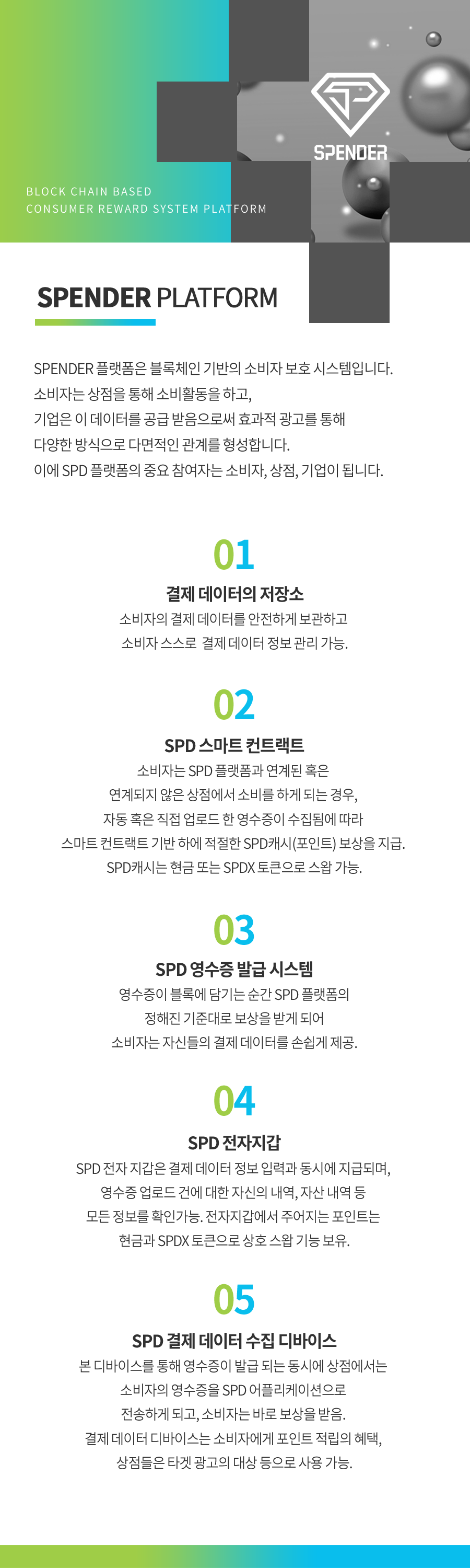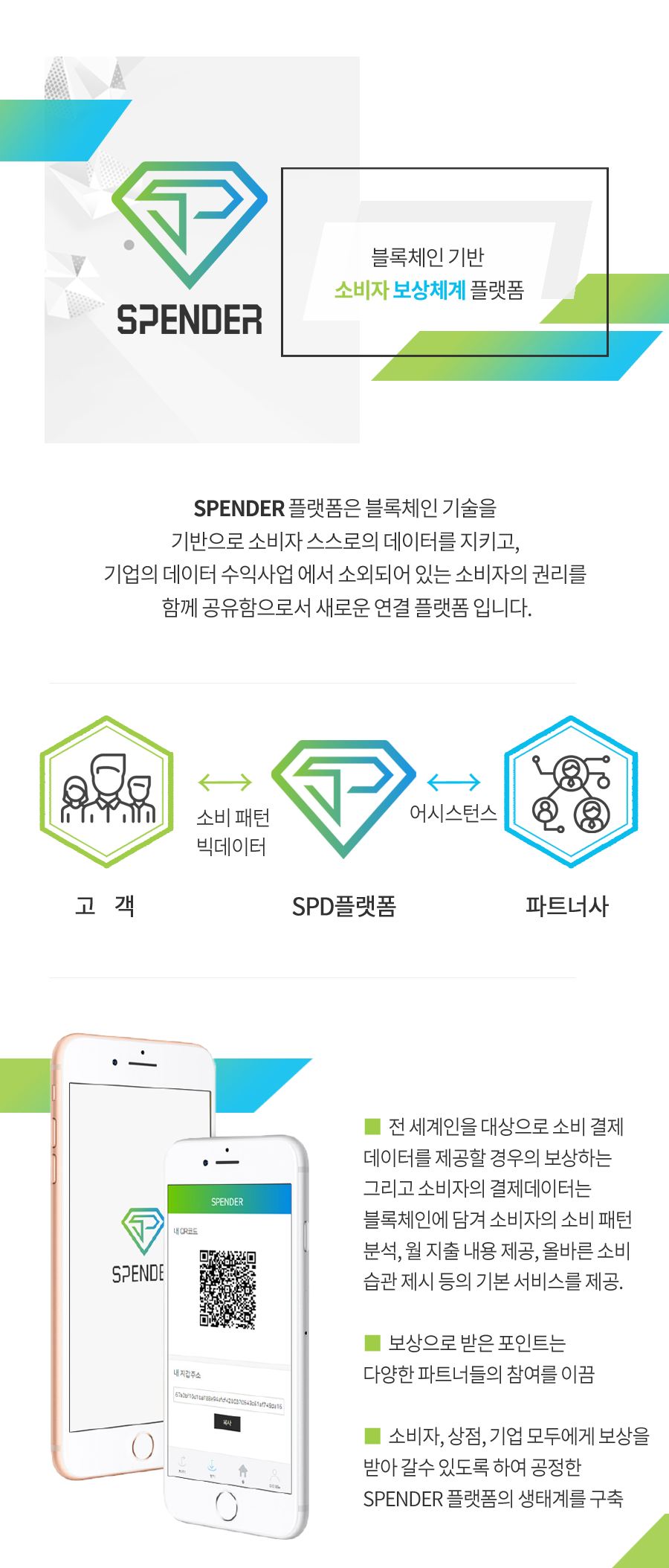 앱테크에서 가장 중요한 것은 플랫폼인데요, 스팬더는 소비자의 결제 데이터를 안전하게 보관 및 정보관리 기능이 있습니다. 소비자는 스팬더 플랫폼과 연계 유무와 상관없이 소비할 경우 영수증을 수집할 수 있으며 수집 된 영수증에 따라 스마트 컨트랙트 기반 하게 적절한 SPD를 보상합니다.