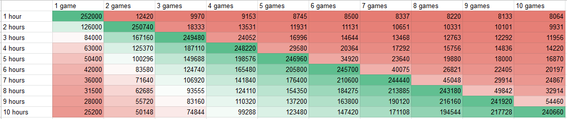 What you don't want to do, as we move down the chart, is miss hours. Say we only played 1 game every 2 hours. We get just over half as much DEC than if we were to play 10 games then wait 10 hours. This shows as we move into the red in the bottom left-hand side of the chart.