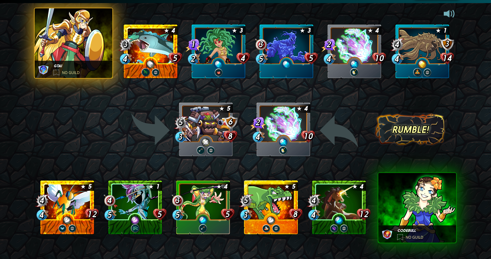 | Lyanna Natura (Lvl 4), Unicorn Mustang (Lvl 4), Furious Chicken (Lvl 4), Screeching Vulture (Lvl 5), Khmer Princess (Lvl 4) | Win View | Alric Stormbringer (Lvl 5), Battle Orca (Lvl 5), Sabre Shark (Lvl 4), Water Elemental (Lvl 3), Pirate Archer (Lvl 5), Furious Chicken (Lvl 5) |