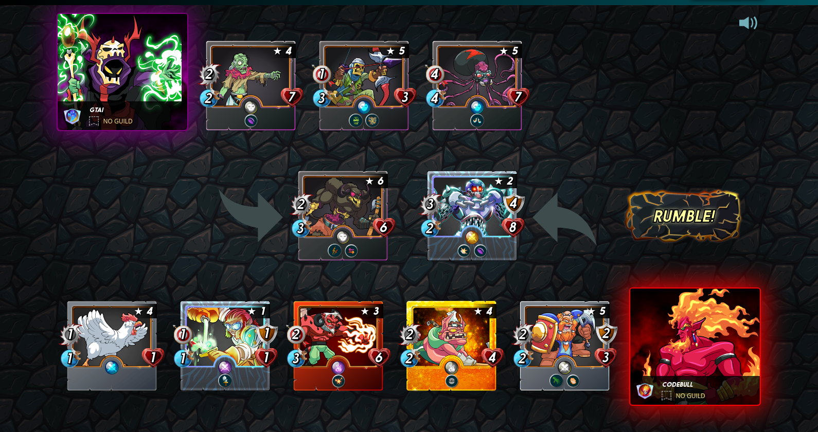 | Malric Inferno (Lvl 4), Chain Golem (Lvl 2), Grumpy Dwarf (Lvl 5), Kobold Miner (Lvl 4), Fire Demon (Lvl 3), Halfling Alchemist (Lvl 1), Furious Chicken (Lvl 4) | Win View | Zintar Mortalis (Lvl 5), Undead Minotaur (Lvl 6), Animated Corpse (Lvl 4), Undead Archer (Lvl 5), Octopider (Lvl 5) |