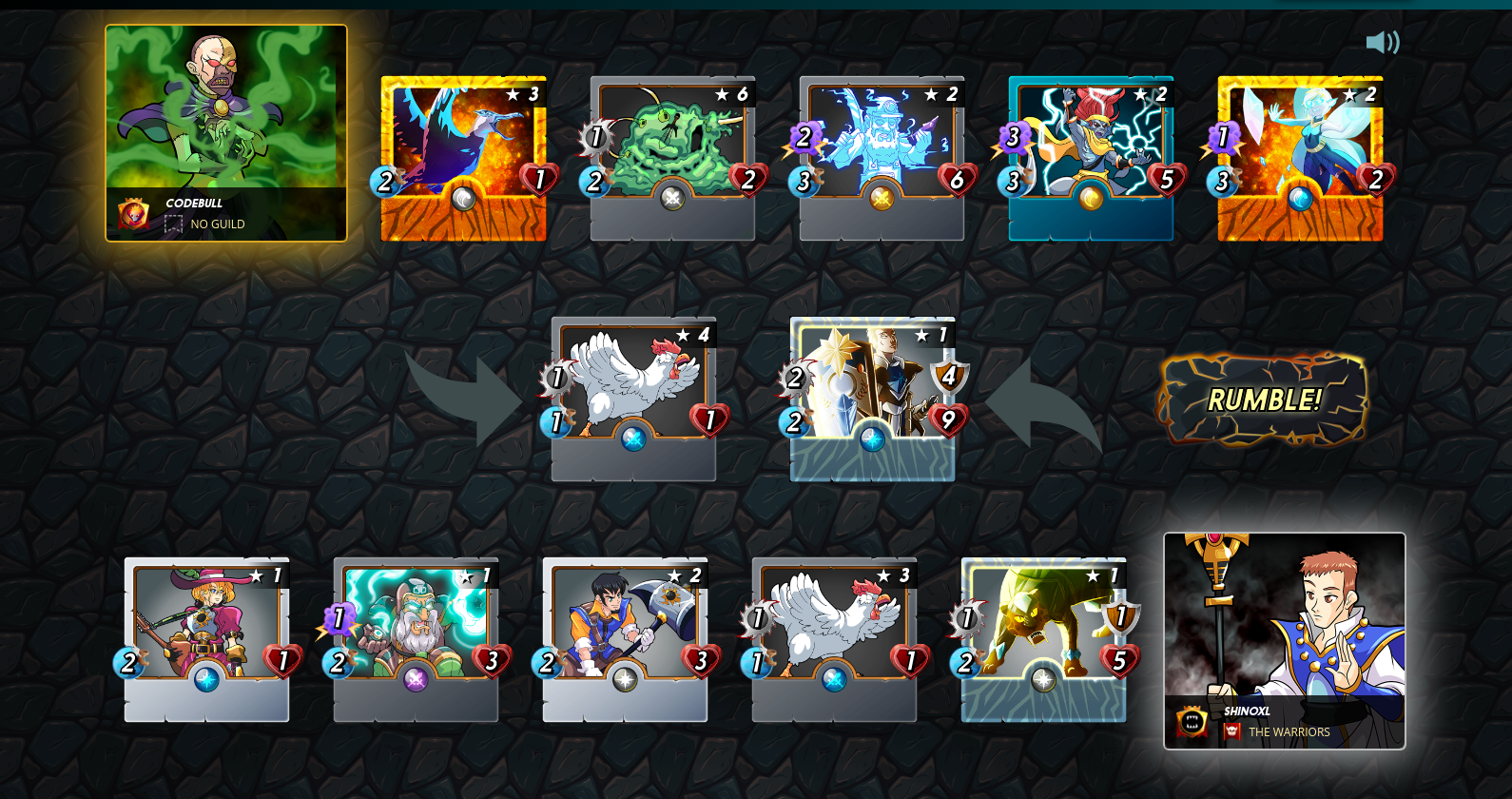 | Delwyn Dragonscale (Lvl 6), Furious Chicken (Lvl 4), Albatross (Lvl 3), Creeping Ooze (Lvl 6), Spirit Miner (Lvl 2), Ruler of the Seas (Lvl 2), Ice Pixie (Lvl 2) | Win View | Tyrus Paladium (Lvl 3), Shieldbearer (Lvl 1), Crystal Jaguar (Lvl 1), Furious Chicken (Lvl 3), Armorsmith (Lvl 2), Dwarven Wizard (Lvl 1), Silvershield Bard (Lvl 1) |