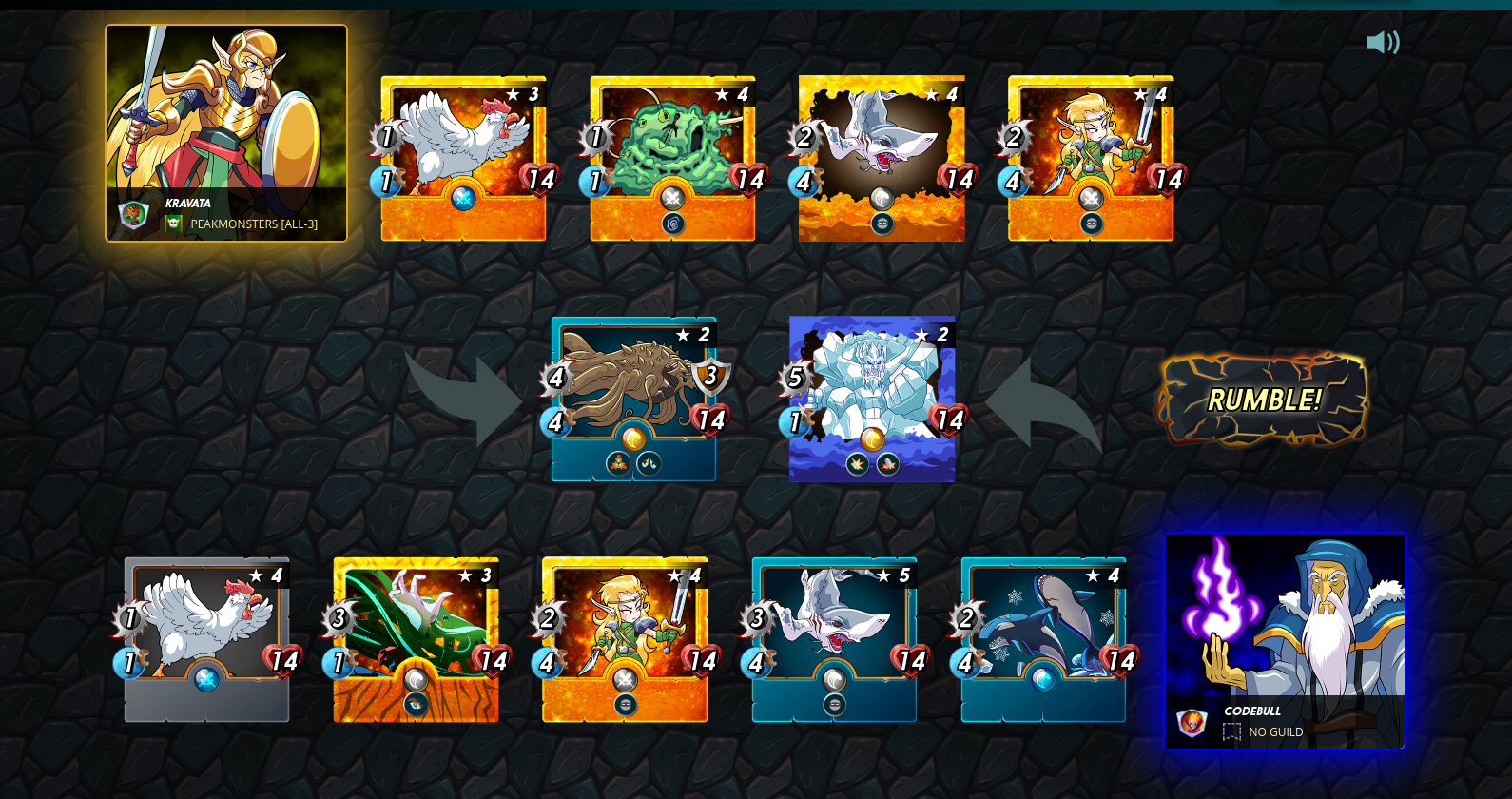 | Alric Stormbringer (Lvl 4), Peaceful Giant (Lvl 5), Prismatic Energy (Lvl 4), Sea Genie (Lvl 5), Ice Pixie (Lvl 2), Enchanted Pixie (Lvl 1), Pirate Archer (Lvl 4) | Loss View | Yodin Zaku (Lvl 2), Furious Chicken (Lvl 3), Peaceful Giant (Lvl 5), Fire Beetle (Lvl 5), Highland Archer (Lvl 5), Goblin Chariot (Lvl 3), Mantoid (Lvl 5) |