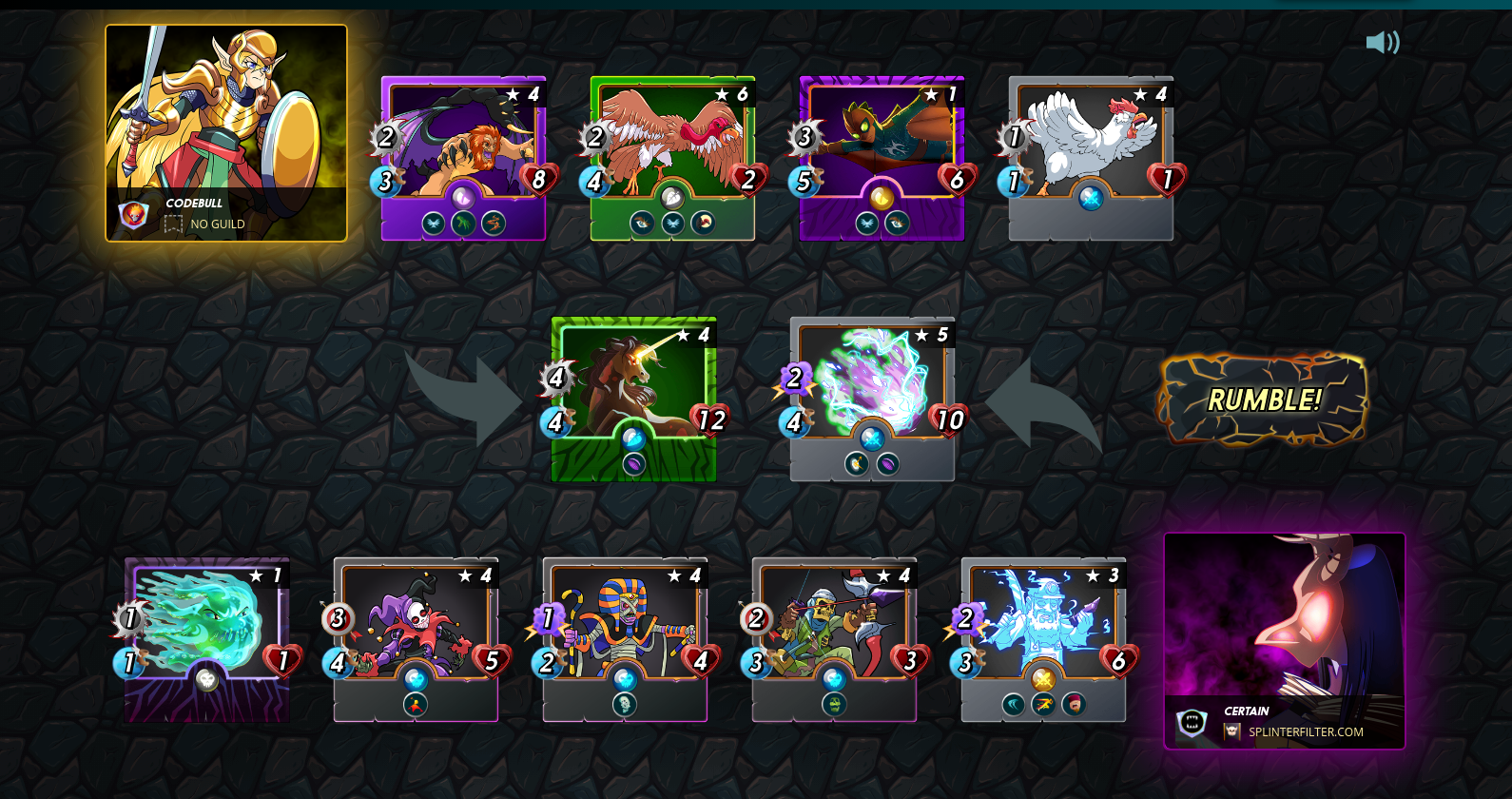 | Alric Stormbringer (Lvl 4), Furious Chicken (Lvl 4), Prismatic Energy (Lvl 4), Ruler of the Seas (Lvl 2), Ice Pixie (Lvl 2) | Win View | Lyanna Natura (Lvl 3), Flesh Golem (Lvl 4), Cocatrice (Lvl 3), Brownie (Lvl 2), Furious Chicken (Lvl 3), Magi of the Forest (Lvl 2), Goblin Sorcerer (Lvl 4) |