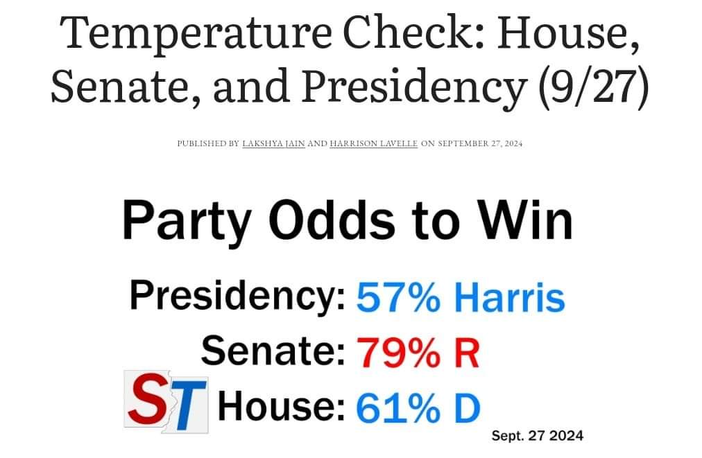 Harris with 57% chance to win the presidency. Republicans with a 79% chance to take the Senate. And Democrats with a 61% chance to win the House.