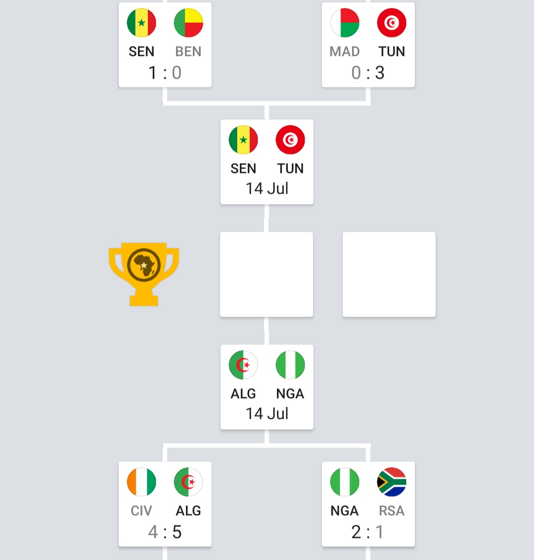 The two semifinal games will be on the 14th when Senagal take on Tunisia and Algeria and Nigeria will battle it out later that day.