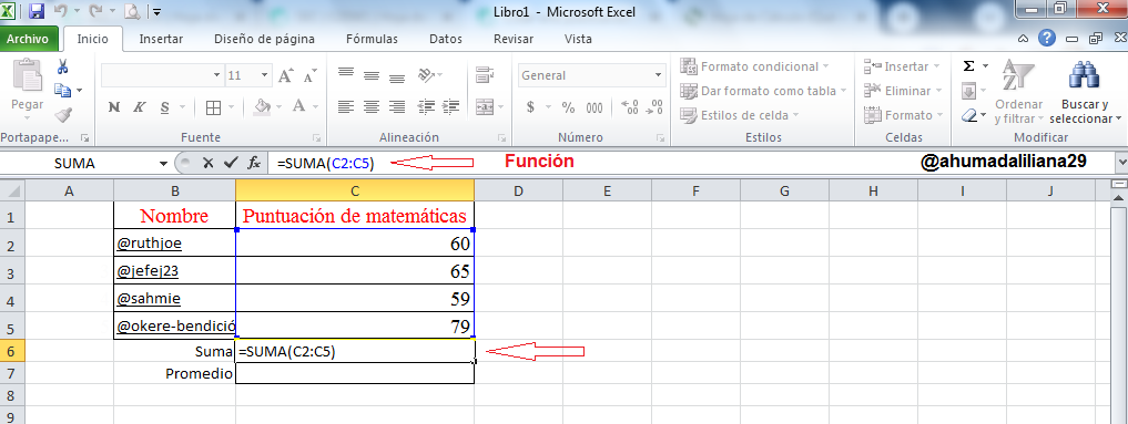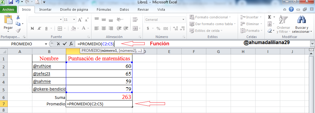 De esta manera vemos que automáticamente se coloca la funcion Promedio y solo debemos especificar las celdas que deseamos sean parte del calculo, que en este caso seria desde la C2 hasta la C5. Quedando de la siguiente manera: =PROMEDIO(C2:C5).
