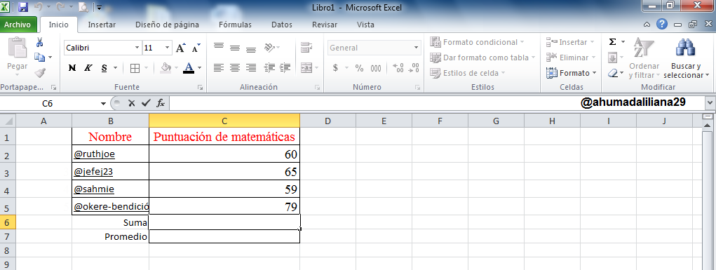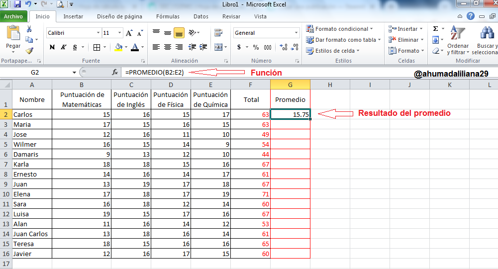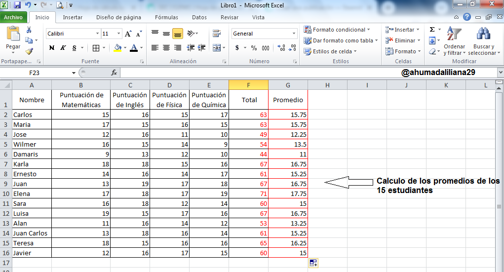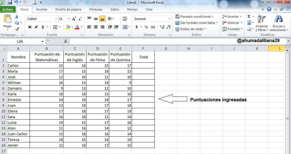 Luego procedí a introducir los nombre de los 15 estudiantes y las puntuaciones correspondientes a las materias de: matemáticas, ingles, física y química.