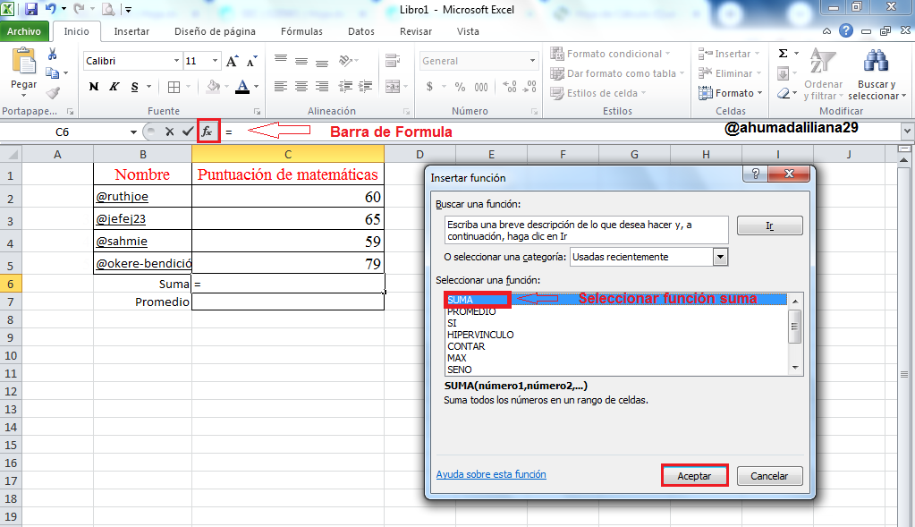 Para calcular la suma de las puntuaciones, me ubique en la barra de funciones y oprimí el boto "Insertar función" y se abrió una ventana en la que están las diferentes funciones que podemos realizar, en este caso, necesitamos calcular una Suma, por eso seleccione esta función.