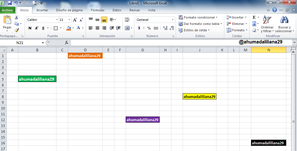Toma una captura de pantalla de tu hoja de cálculo e identifica las direcciones de las celdas siguientes: N16 con un color de relleno negro, J8con un color de relleno amarillo, B5con un color de relleno verde, G12 con un color de relleno morado y D1 con un color de relleno naranja. Escribe tu nombre de usuario en estas celdas usando una fuente visible.