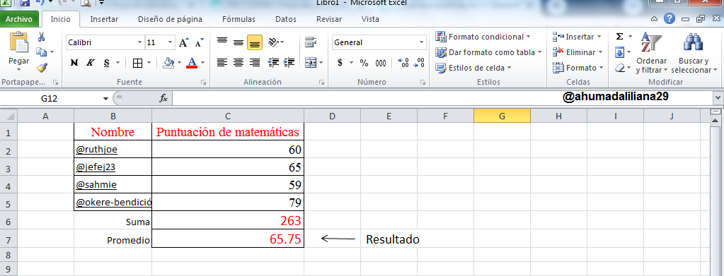 Para terminar este calculo, tan solo debemos oprimir el botón "Enter" y veremos que automáticamente obtendremos el resultado del promedio el cual corresponde a 65.75.