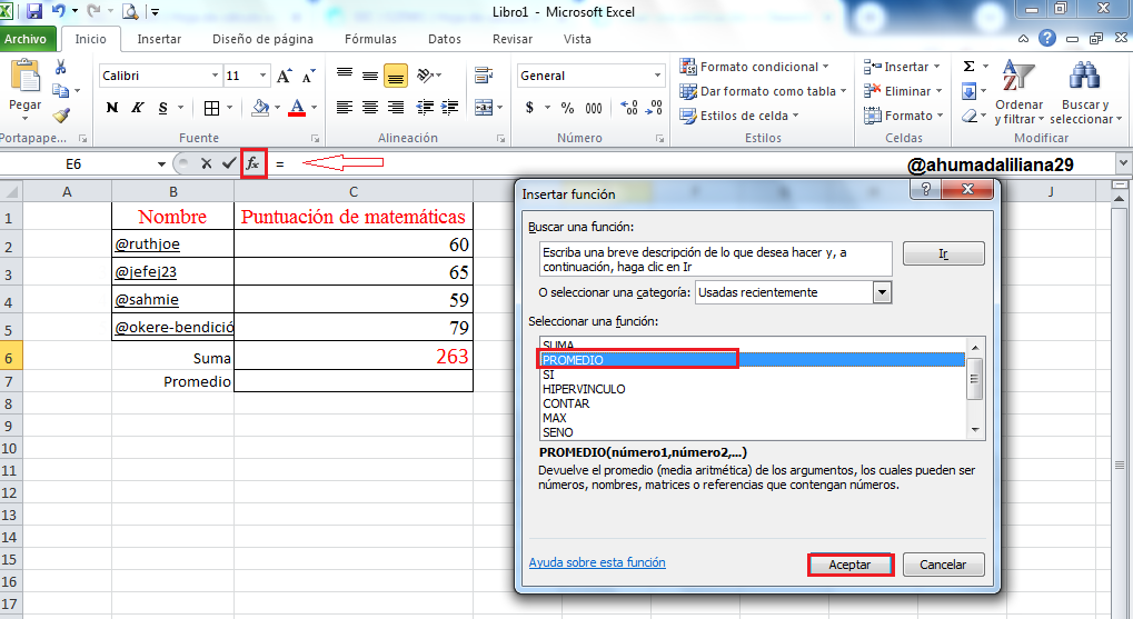 Ahora bien, para calcular el promedio, debemos realizar el mismo procedimiento, por lo que nos vamos a ubicar en la celda en la que deseamos realizar esta operacion, luego nos dirigimos a la barra de funciones, y seleccionar "Promedio".