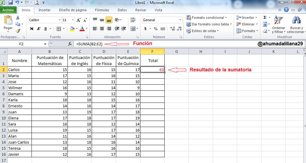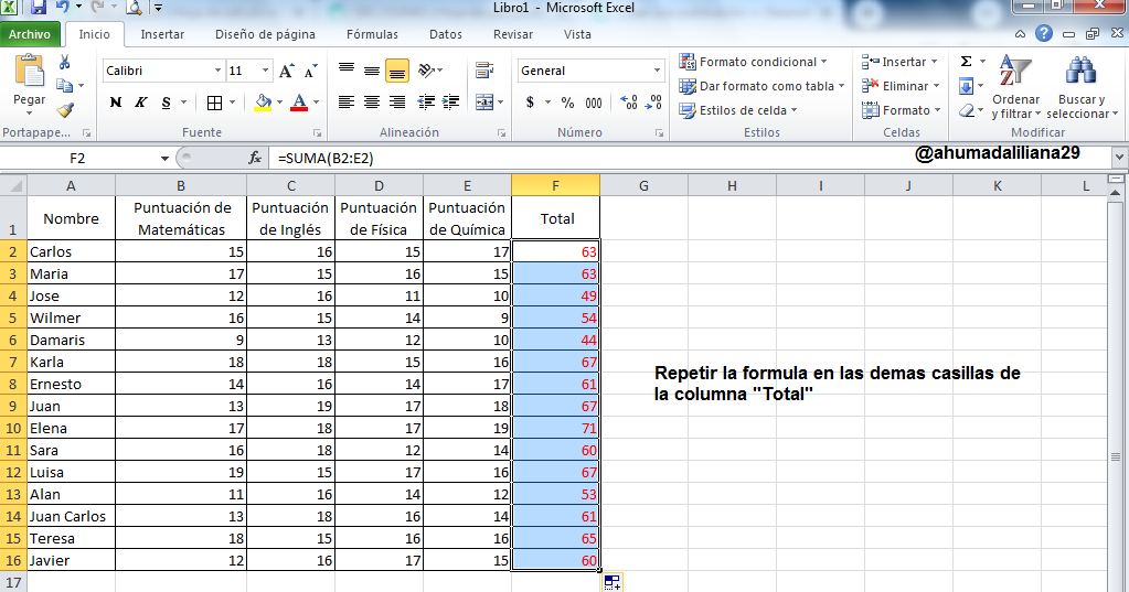 Ahora bien, para evitarnos el trabajo de repetir este procedimiento en las 14 celdas restantes de la culumna "Total" y realizar la sumatoria de las notas de cada estudiante, tan solo debemos ubicarnos en la celda F2 y al colocar el cursor en la esquina derecha inferior de esta celda, tan solo debemos hacer clic y arrastrar el cursor hacia las demás casillas de abajo y automáticamente se aplicara esta misma formula y obtendremos la sumatoria de todas las notas de forma casi automática. Esta es una función que logra un alto nivel de eficiencia al procesar o manipular los datos.