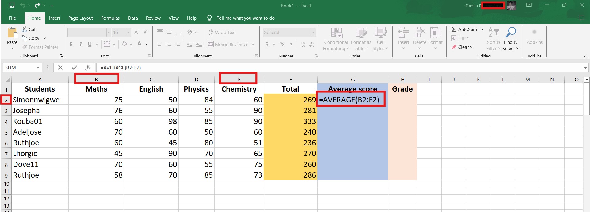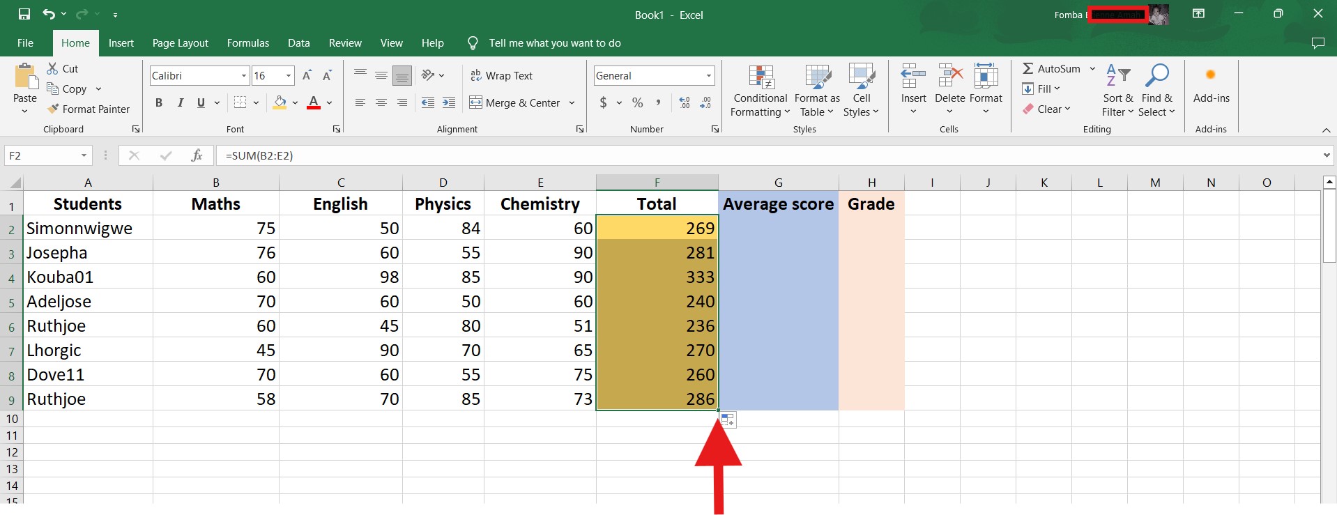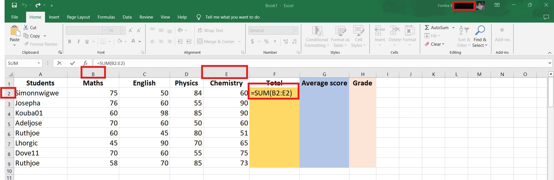 To get the total scores for all subjects, we will be making use of a simple SUM function. I have created a new column Total. Click in the first cell, to apply the function.