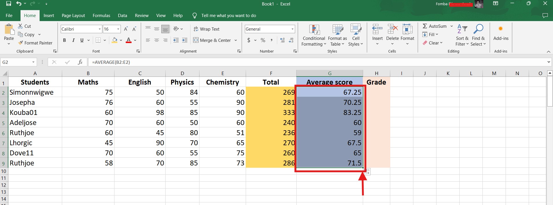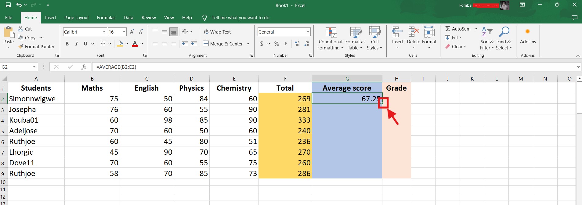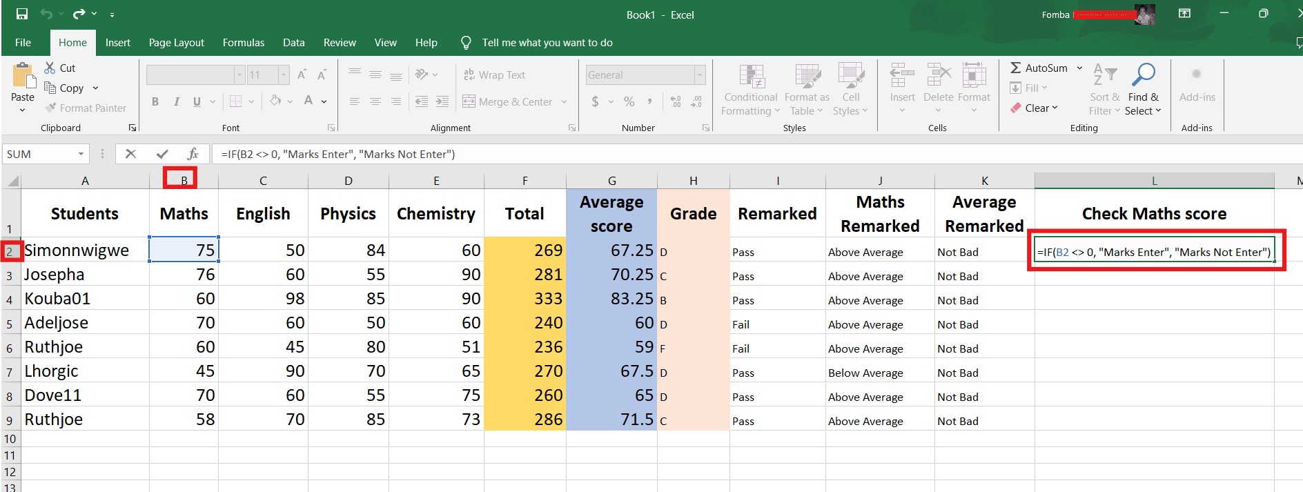 To get the total scores for all subjects, we will be making use of a simple SUM function. I have created a new column Total. Click in the first cell, to apply the function.