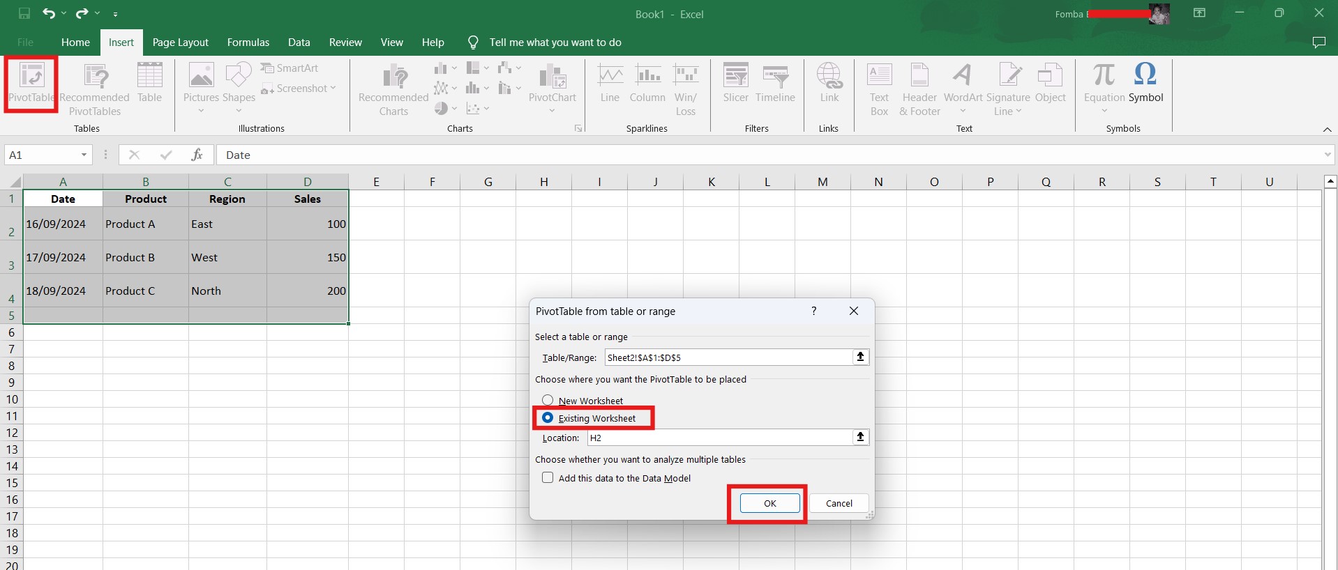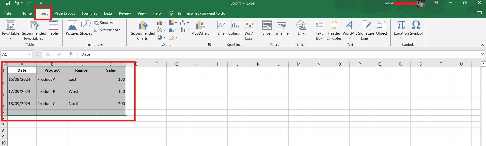 Click Insert and highlight all the cells containing the data.