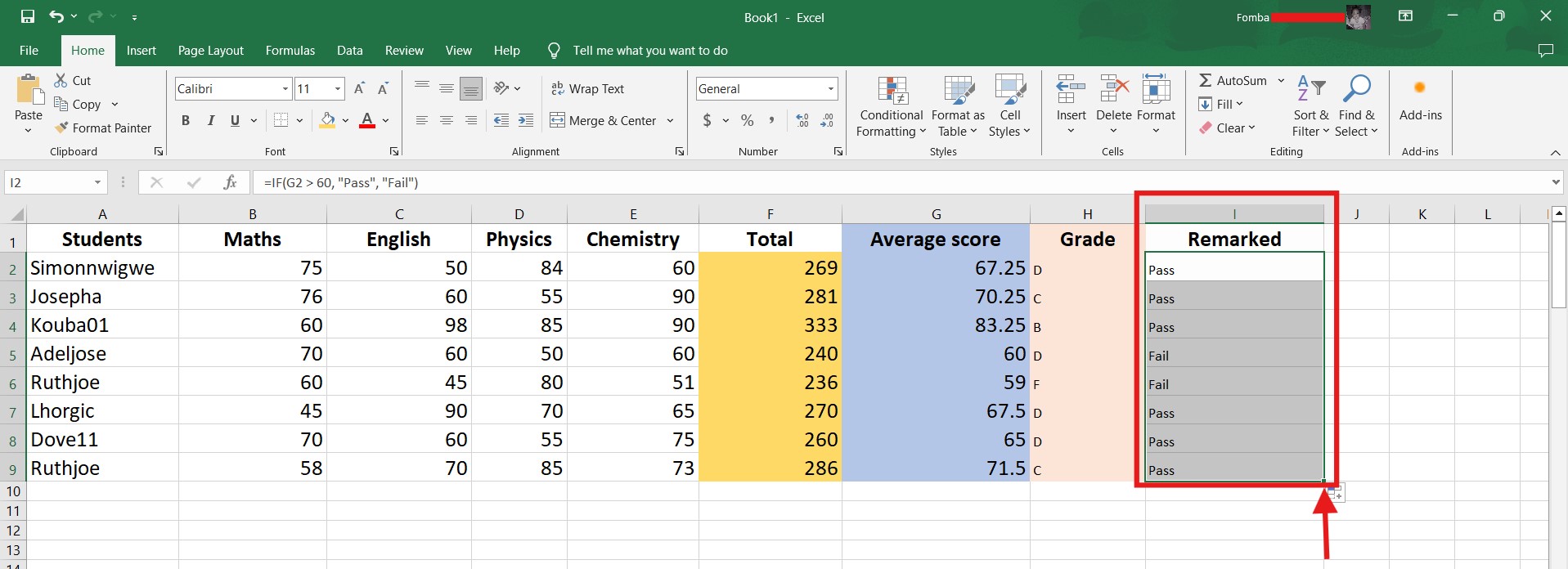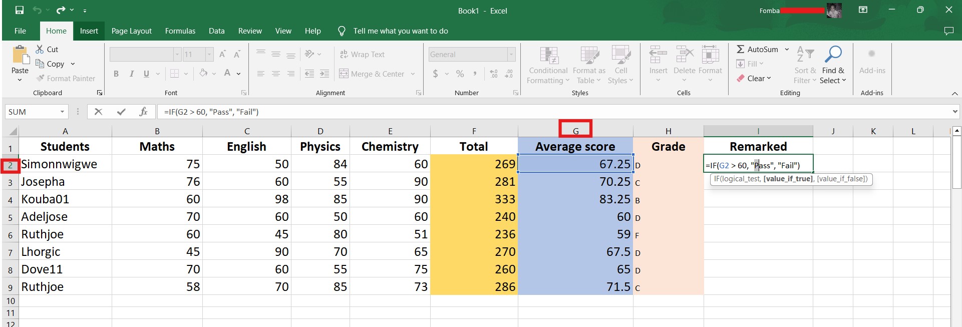 =IF(G2 > 60, "Pass", "Fail")
