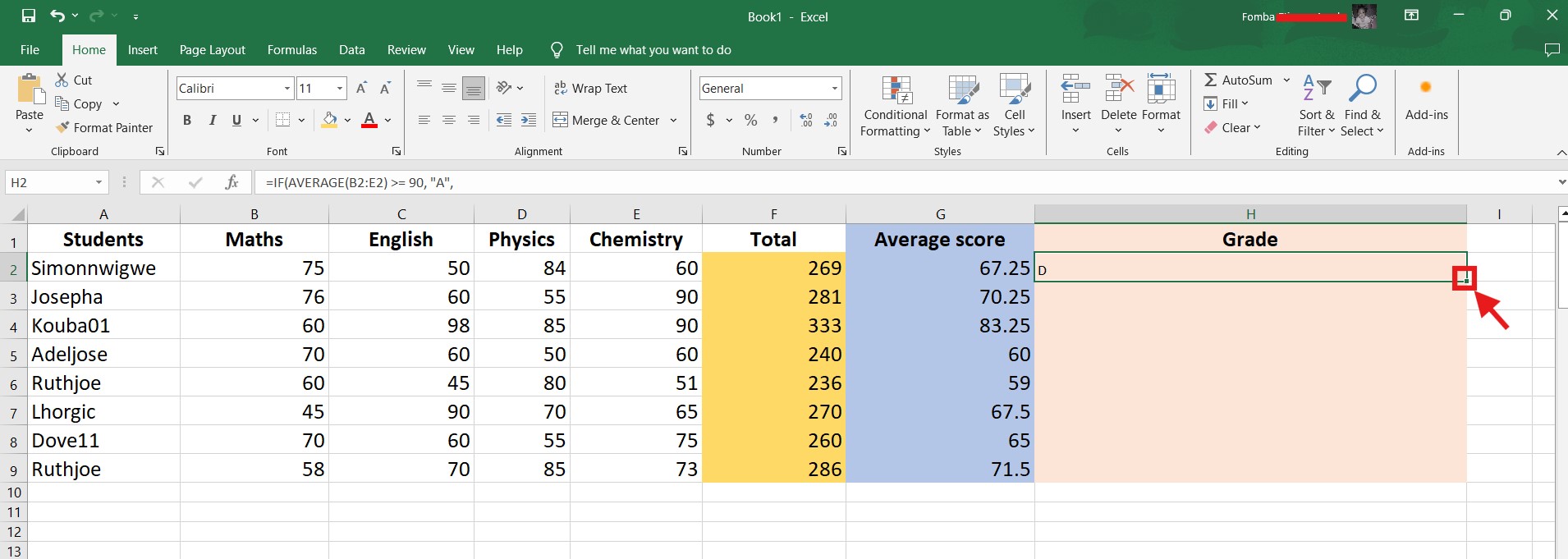 =IF(AVERAGE(B2:E2) >= 90, "A",