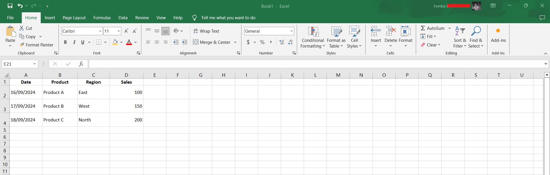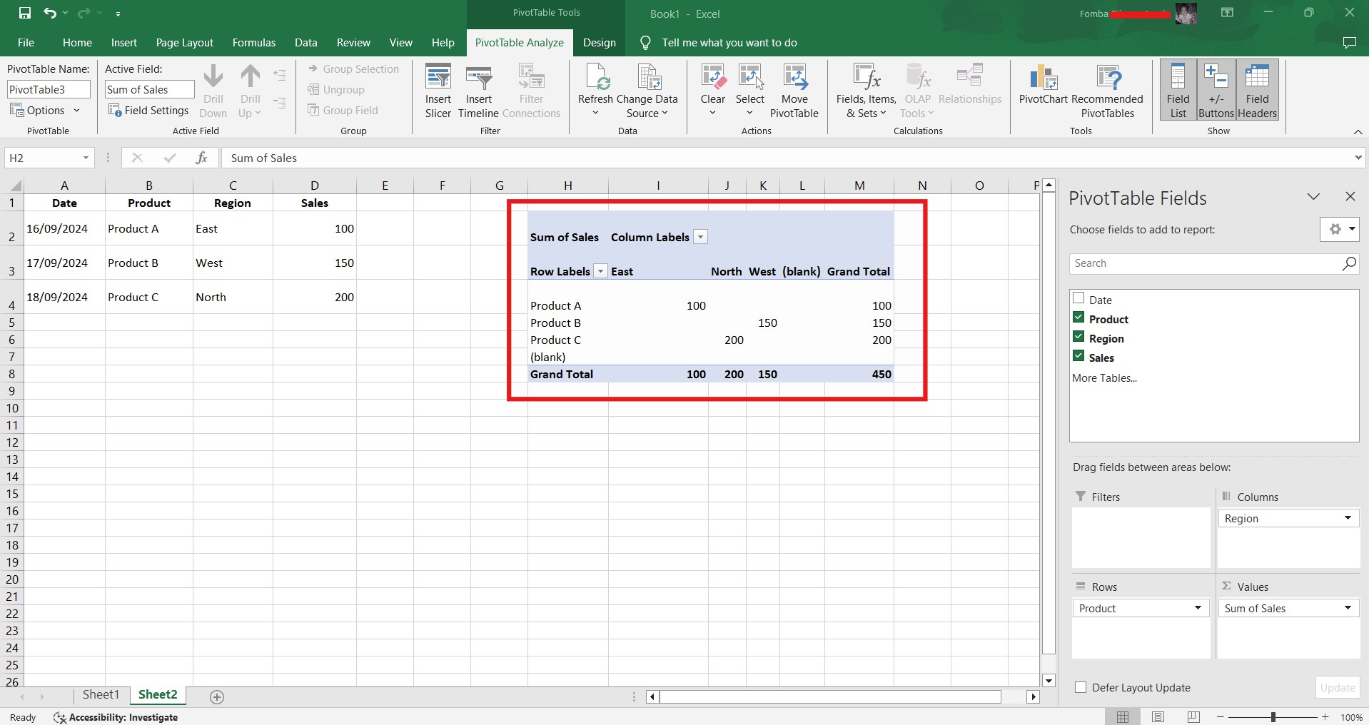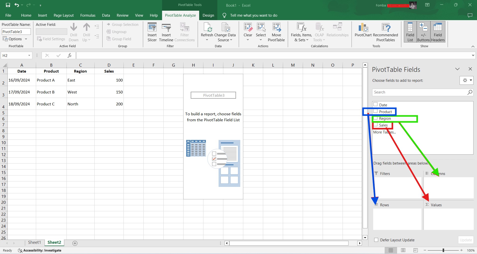 Based on the given data below: Create a pivot table that shows (see) total sales by product, by dragging the product to the Rows areas, Region to the Column area, and Sales to the Values area. Please we want to see the steps you take in adding your pivot table.