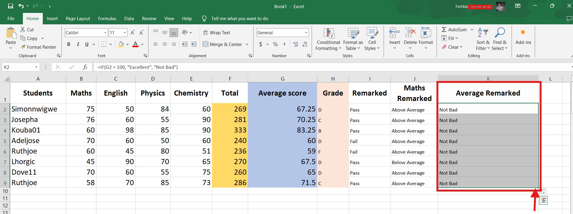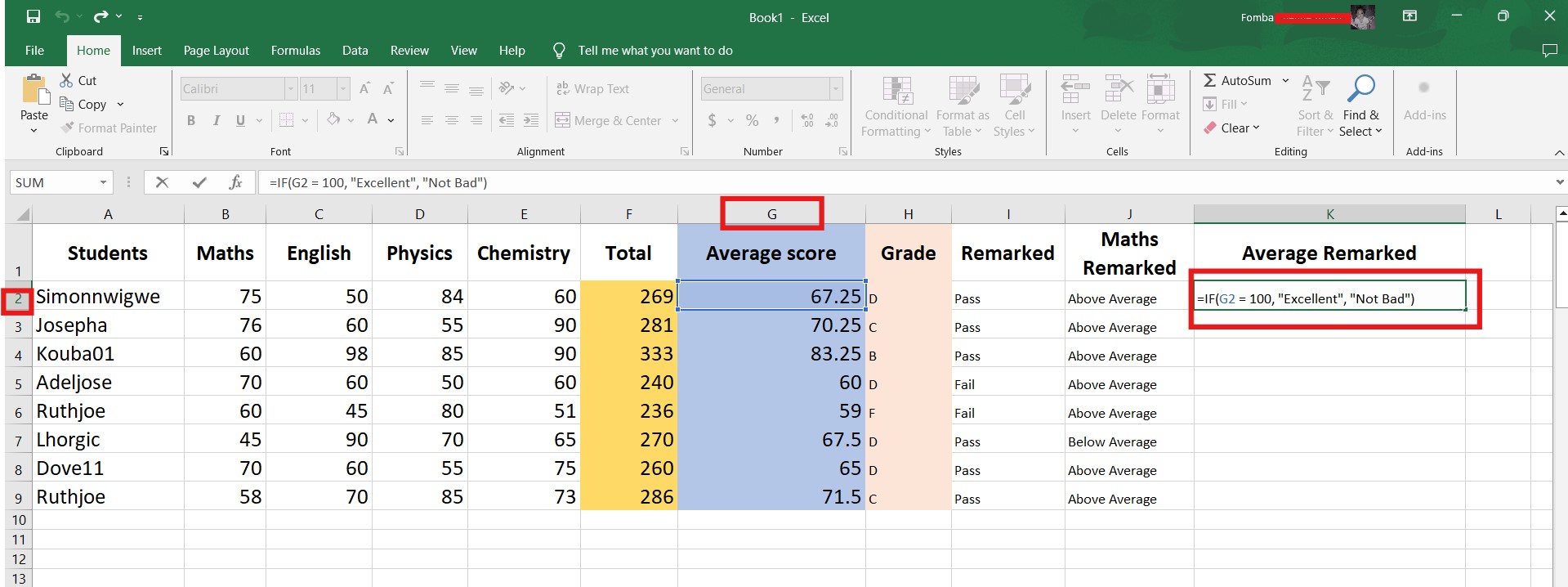 =IF(G2 = 100, "Excellent", "Not Bad")