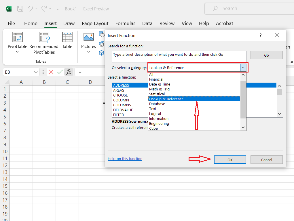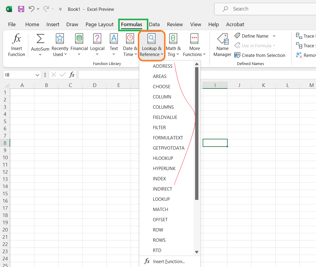 "Formulas"tab and click on the "Insert Function" button to access the function library.